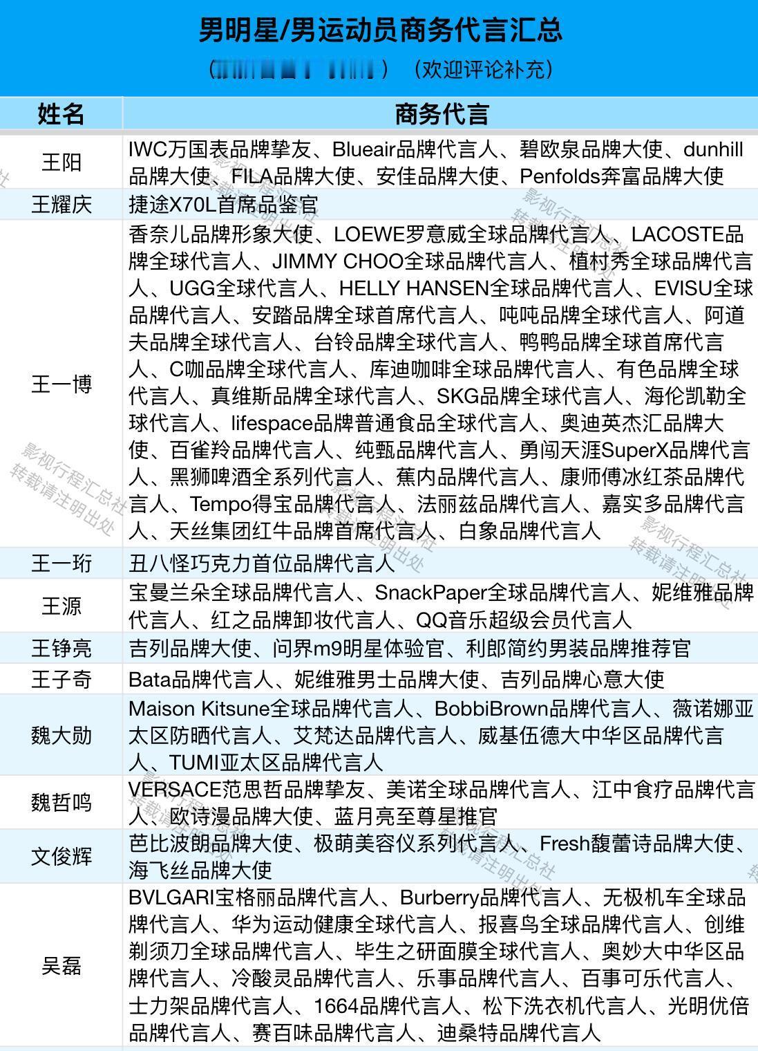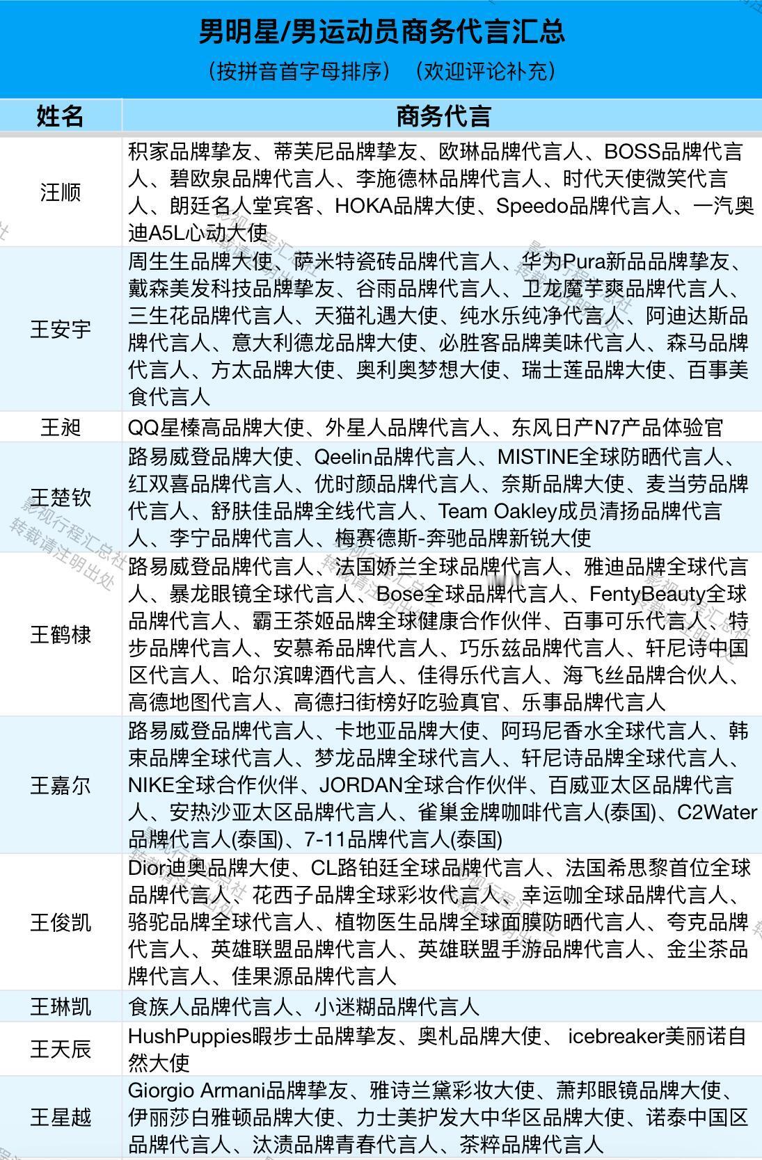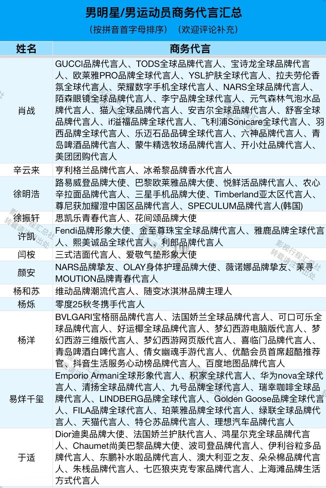 男明星/男运动员商务代言汇总(按拼音首字母排序)阿云嘎、敖瑞鹏、敖子逸、白敬亭、白客、白宇、毕雯珺、蔡徐坤、曹骏、曾舜晞、常华森、陈楚生、陈道明、陈飞宇、陈伟霆、陈鑫海、陈星旭、陈哲远、丞磊、成毅、登陆少年团、邓超、邓为、翟潇闻、丁禹兮、窦骁、段奕宏、樊振东、范丞丞、付辛博、龚俊、郭麒麟、韩庚、何浩楠、侯明昊、胡歌、胡先煦、胡一天、华晨宇、黄景瑜、黄晓明、黄星、黄子弘凡、蒋奇明、靳东、井柏然、雷佳音、李耕耘、李昊、李乃文、李现、李昀锐、梁伟铿、林高远、林更新、林一、刘昊然、刘轩丞、刘烨、刘宇、刘宇宁、陆虎、鹿晗、鹭卓、罗晋、罗一舟、罗云熙、马柏全、马龙、毛不易、欧豪、潘展乐、彭于晏、彭昱畅、邱鼎杰、任嘉伦、沙溢、沈腾、时代少年团、宋威龙、苏翊鸣、檀健次、田嘉瑞、田栩宁、汪顺、王安宇、王昶、王楚钦、王鹤棣、王嘉尔、王俊凯、王琳凯、王天辰、王星越、王阳、王耀庆、王一博、王一珩、王源、王铮亮、王子奇、魏大勋、魏哲鸣、文俊辉、吴磊、肖战、辛云来、徐明浩、徐振轩、许凯、闫桉、颜安、杨和苏、杨烁、杨洋、易烊千玺、于适、余承恩、展轩、张彬彬、张杰、张康乐、张凌赫、张若昀、张晚意、张新成、张艺兴、张云龙、张震、章昊、郑恺、郑业成、周杰伦、周柯宇、周深、周翊然、朱嘉琦、朱亚文、朱一龙、卓沅、梓渝