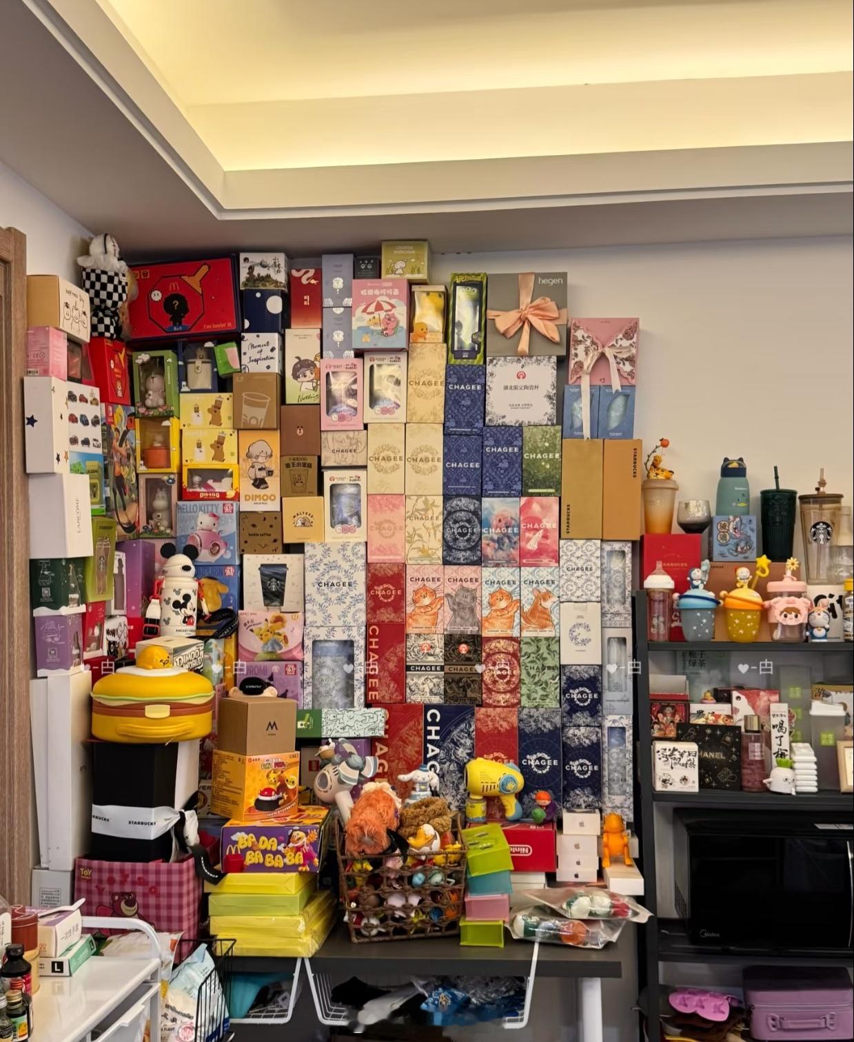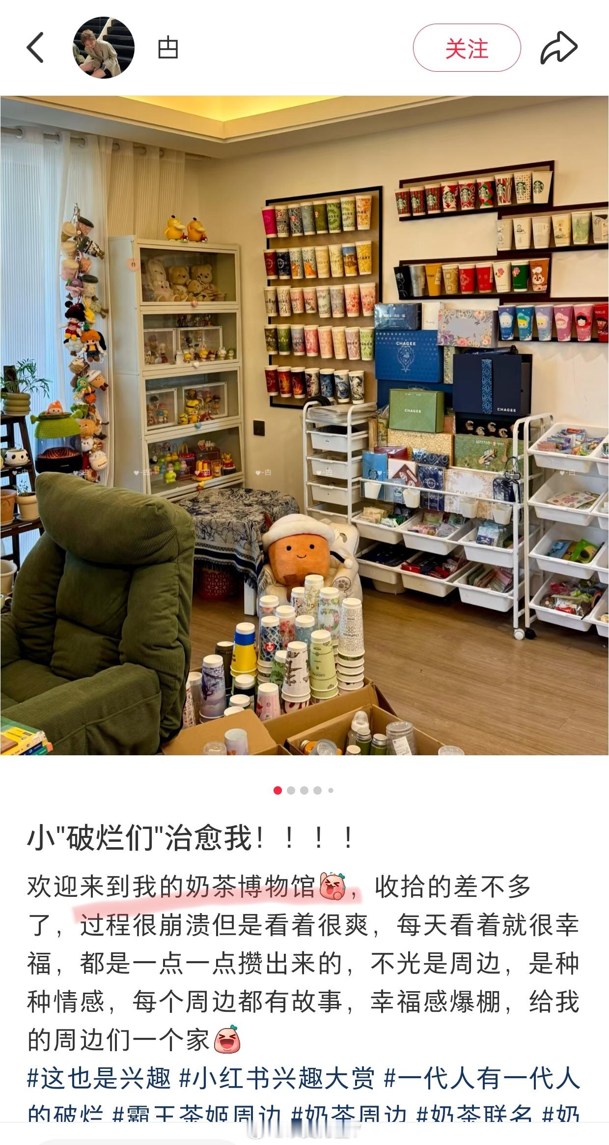 收藏这种爱好其实很有意思,它是最能体现时代感的。比如70后们大都收藏过粮票,80后们大多都集过烟盒,70、80后们都收藏过钱币、邮票、火车票、机票等等。但是新世纪出生的孩子们已经很少有使用邮票的场合了,他们使用现金都越来越少,火车票机票也都扫码刷身份证即可了……传统的收藏爱好已经式微,但同时新时代也有很多好玩的可以收藏,比如奶茶周边,比如之前火遍全球的丑萌娃娃……这位藏家收藏了上千件奶茶周边,以后也真能开一个私人的奶茶博物馆了,可以讲述中国茶文化的历史,不同奶茶的特色,口味,包装,这也算是新时代茶文化的一个补充
