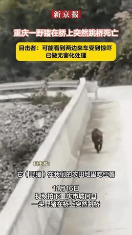 “无路可走了!”重庆一只野猪在桥边的农田里偷吃红薯,一辆大货车开过来,把它吓了一大跳,野猪慌不择路,直接从桥上跳了下去。 这简直就是“才出狼窝,又入虎穴”啊。 原来野猪刚跑上桥,发现桥那头正好有两辆摩托车也“突突”地开过来了。 好家伙,前有摩托,后有货车,这头野猪被夹在桥中间,进退两难,彻底成了“夹心饼干”! 估计是吓坏了,再加上它可能也没搞明白桥外头是啥情况,不知道高低深浅。 所以心一横,竟然纵身一跃,直接从桥栏杆跳了下去。 桥下是布满石头的河道,二十多米高啊,野猪摔下去当场就不行了。 拍下视频的胡先生后来和村民一起,把这头野猪拖走,挖了深坑做无害化处理了,就是怕尸体腐烂发臭引发问题。 有网友感慨:“前后夹击,慌不择路,动物在人类地盘生存真不容易。” 这话说的真是相当到位。 野猪确实是很委屈,它们在林地农田觅食,本来过得挺自在。 可人类活动范围扩大,修路架桥无意中切割了它们的栖息地,让它们不得不在“夹缝”中生存。 选择纵身一跃,不是因为野猪不想活了,而是动物在恐慌下的本能逃生反应。 对它们来说,钢铁洪流比未知的悬崖更可怕。 如果司机远远看到动物能稍减速、鸣个笛提醒,或许就能给它们留出逃生通道。共存需要的不是退让,而是多一份理解的智慧。 所以啊,这头野猪的悲剧,与其说是“傻”,不如说是提醒我们,修路架桥联通了人与人的距离,但也别忘了给原住民“留条小路”! 重庆一野猪在桥上跳桥死亡