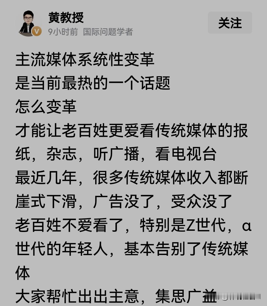 一石激起千层浪,黄教授请大家来帮忙! 11月17日,一向谨慎的@黄教授 发布微头条:最近几年,很多传统媒体收入都在断崖式下滑,广告没了、受众没了、老百姓不爱看了,基本告别了传统媒体…… 黄教授请大家集思广益,帮忙出出主意,怎么变革才能让老百姓更爱看报纸、杂志、广播、电视这样的传统主流媒体? 其实,如果说网友们完全抛弃了主流媒体,这样的思维有点偏激。只要主流媒体办的好,照样可以赢得网友们的认可。例如,电视台播放的“问政山东”就是一个好节目,这样的节目既发挥了舆论监督作用,现场还能解决老百姓关心的实际问题,当然会受到观众的欢迎! 所以,希望新闻媒体坚持党的领导下报道真相,少插播一些粗制滥造的广告,一个遥控器能看电视,别每天播那些粗制滥造的降智片……希望先从这些简单的问题解决起,再谈主流媒体变革的问题。