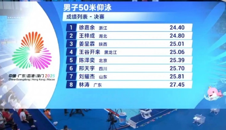 全运会男子游泳50米仰泳决赛,徐嘉余24秒40夺得金牌,本届全运会4金收官!