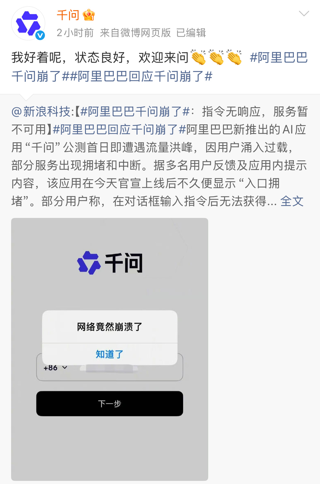 “千问”公测第一天就崩了,朋友圈、微信群都刷屏了。后面下载完APP,体验了深度思考、AI生图几个功能,确实比想象中的要好。难怪一上线就被挤崩了。不过千问团队也挺稳,一边紧急给服务器打鸡血扩容,一边发文称:“好着呢!欢迎大家来撩!”,这波操作又让人觉得千问还是靠谱的。