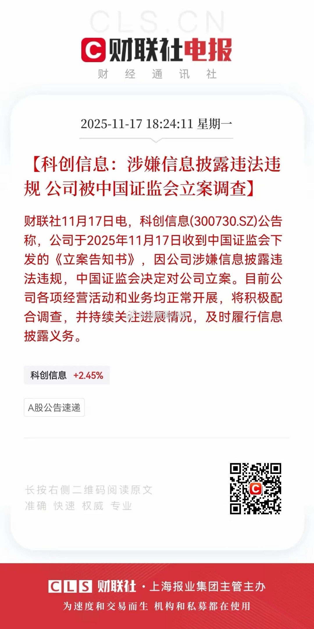 科创信息突然公告被证监会立案,3.81万股东晚上估计要失眠了。今天(11月17日)科创信息(300730)突然公告被证监会立案,原因是“涉嫌信息披露违法违规”,这消息对咱们散户来说,简直是平地起惊雷。咱们散户最惨的是“信息差”:公司说“经营正常”,但立案调查的具体原因没讲——是业绩造假?还是重大事项没披露?这些都不清楚,现在进去接盘就是赌运气。信息披露违规可不是小问题,轻则罚款、警告,重则可能涉及信披造假、财务舞弊,要是后续调查坐实了,股价大概率得挨锤。你看今天公告出来前,股价还涨了2.45%,现在消息一落地,明天开盘估计就得慌。要是手里真有这票,明天开盘先盯着量能,要是低开低走还放量,别犹豫先减仓;要是高开,也别贪,趁机走一部分。总之,这种“雷票”现阶段少碰为妙。