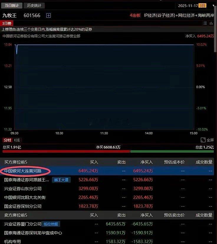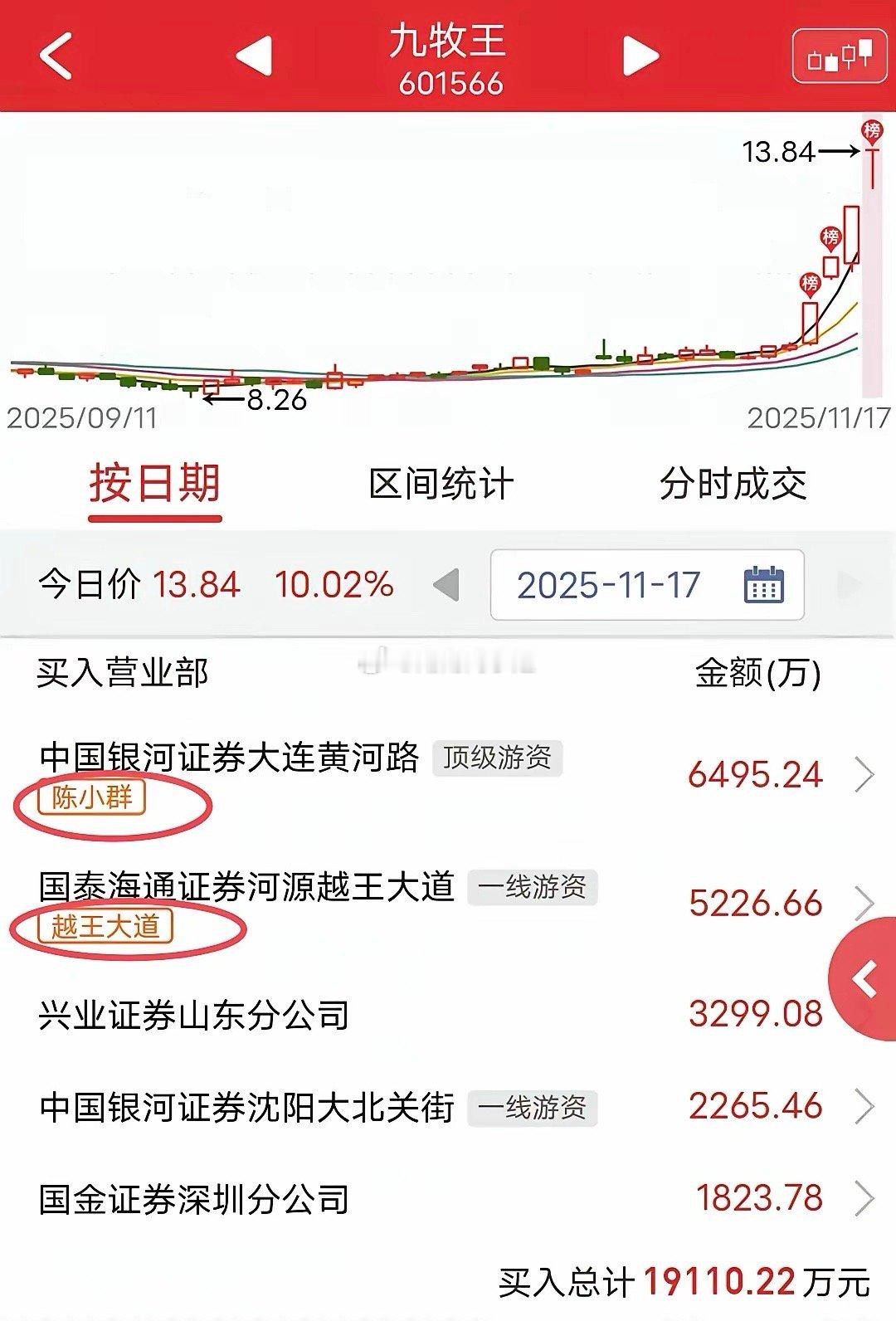 陈小群爆买6500万:今天九牧王开盘快速涨停晋级4板。盘后龙虎榜显示,陈小群买入近6500万,越王大道助攻5200万,直接点火。看来最近短线行情是变好,大佬们也都纷纷出来了。