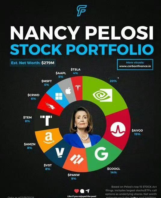 国会山股神佩洛西的股市持仓分布图曝光。预估总资产为2.79亿美元,英伟达占比最高,有百分之二十。多数都是科技公司。 佩洛西非常憎恨马斯克助力特朗普竞选总统,但为了赚钱,她居然也买了特斯拉股票。 再怎样也不能跟钱过不去,挣钱嘛不寒碜,你们说对吧?