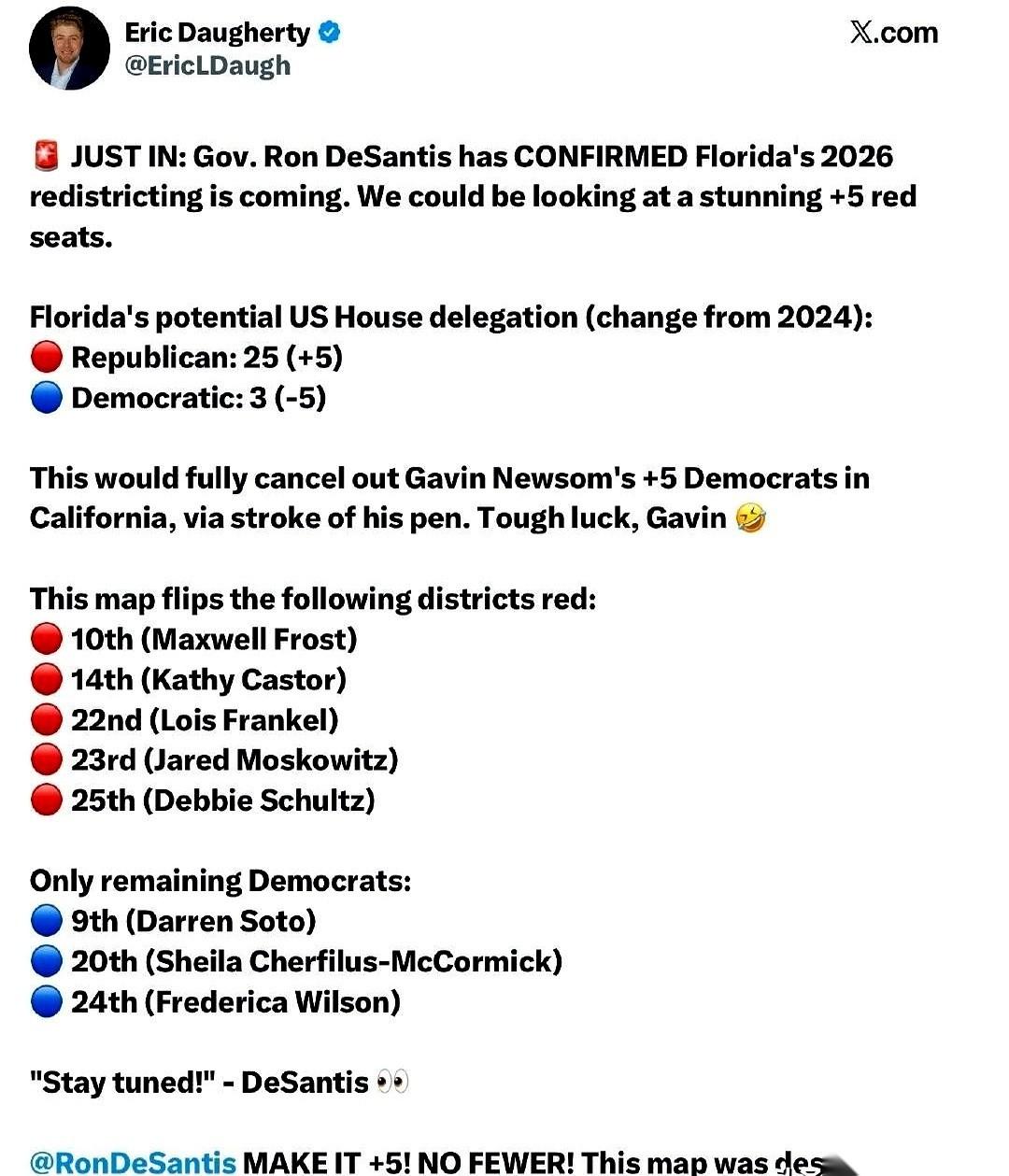 我看到这新闻,第一反应就是:玩得真大。 加州那边刚给民主党“画”出来5个席位,以为稳了。 结果佛州这边,DeSantis二话不说,直接掀桌子。 “你也想要5个?行,那我直接给你抹掉5个。” 这哪是划选区啊,这简直就是在划地盘。 你来我往,一步不让。 Gavin Newsom估计脸都绿了,辛辛苦苦搞半天,直接被人家一招釜底抽薪,白干了。 这事儿说白了,就是一场权力游戏。 地图就是棋盘,笔就是武器。 当游戏规则允许你这么做的时候,强者是不会跟你讲什么情面和客气的。 看着吧,2026年,佛州这张图一旦画完, 那几个名字,Maxwell Frost, Kathy Castor, Lois Frankel……他们的椅子,说抽走就抽走了。 最后只剩下3个民主党的“幸存者”孤零零地杵在那儿。 DeSantis那句“敬请期待”,翻译过来就是: 好戏,才刚开始。 而且目标极其明确: 一个都不能少,必须+5!