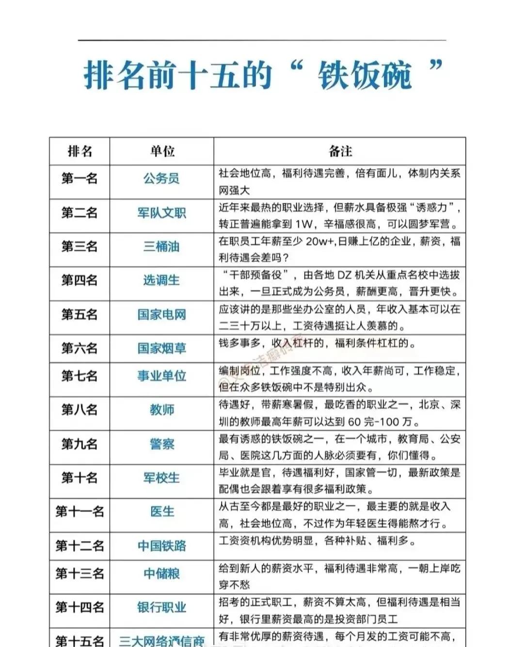 在当前就业环境下,“铁饭碗”行业通常具有抗风险能力强、需求持续刚性、有政策托底支撑等特点以下是一些被认为是铁饭碗的行业 公共服务领域: 公办学校教育:义务教育阶段教育需求永恒,“十五五”规划推动教师待遇提升和职称晋升渠道完善。乡村教师因乡村振兴战略,补贴增加,岗位缺口大,稳定性高,还有寒暑假等福利。 公立医院医疗:人口老龄化使医疗健康需求大增,2025年我国60岁以上老年人口已突破3亿,慢病管理等需求旺盛。公立医院医护人员职业稳定性强,且医生、护士等岗位越资深越有价值。 体制内核心岗位: 公务员:税务局、社保局、发改委等单位岗位,承担政策执行与公共管理职能,稳定性高。基层公务员在乡村振兴战略支持下,待遇提升且有晋升倾斜政策。 事业单位:科研院所、公立文化机构等事业单位岗位,凭借专业技术属性与政策扶持,稳定性突出,是许多专业人才的理想选择。 科技创新领域:“十五五”规划将创新置于核心地位,量子科技、6G、人工智能、芯片研发等领域成为政策重点扶持方向。芯片研发工程师、人工智能算法师等岗位,受国家人才计划补贴,企业研发投入大,岗位缺口大,技术不可替代性强,薪资待遇高。 养老与健康服务领域:“积极应对人口老龄化”被纳入“十五五”重点任务,养老护理员、老年康复师、健康管理师等岗位需求爆发式增长。这些岗位需专业技能,国家还提供免费培训、社保补贴等政策支持,职业稳定性强。 乡村振兴领域:“全面推进乡村振兴”是国家长期战略,农业技术推广员、乡村规划师、农村电商服务专员等岗位,解决农村发展核心需求,享受专项津贴或项目资金支持,竞争压力小于城市,职业稳定且有发展空间。 绿色低碳领域:“双碳”目标推动新能源、环保、绿色建筑等产业扩张,新能源工程师(光伏、风电、氢能方向)、碳排放管理师、环保技术人员等岗位,受政策约束与市场需求双重驱动,企业为达标碳排放指标,对相关人才需求持续增长,职业生命周期长。 公共事业与基础保障行业:水电、燃气、铁路、邮政等行业是国家垄断性公共事业,关系民生运转,需求稳定。如铁路系统高铁网络建设与运营维护需大量技术人才,岗位缺口长期存在,且有完善福利体系。