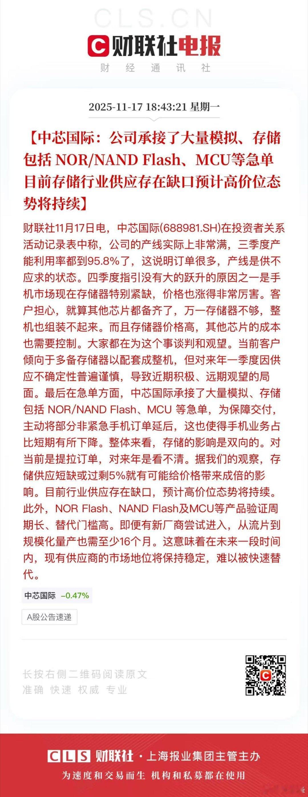 中芯这个公告,其实是给存储浇了一盆凉水,现在为了ai,都去做高端存储。本来手机存储都是头部存储玩家淘汰的产线,但是需求大,还没人做,自然就水涨船高了,以前1毛钱的东西现在1块钱,你能怎么办?中芯国际:,我先帮你们应付一下,以后别找我了,产能恢复后,肯定暴跌,我丑话说在前!