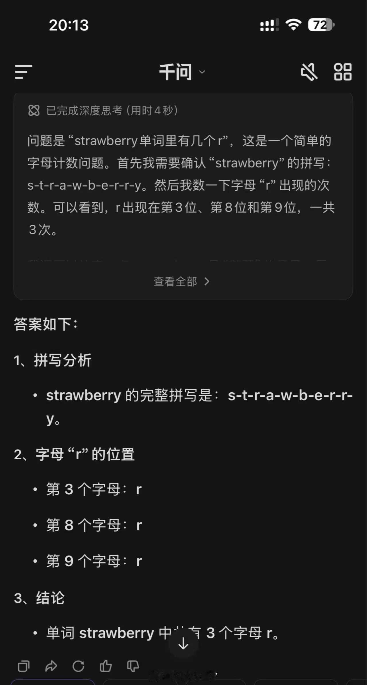 笑死了,之前刁难AI的问题里面就有这个经典的:英文单词“strawberry”里面有几个“r”?结果一堆AI答错了……现在阿里“千问”正式入局AI to C,而行业却迎来了一场最基础的能力测试。9.11与9.8的大小比较,草莓单词中“r”的数量——这些看似简单的问题,恰恰成了检验AI理解与推理能力的试金石。当大模型们在这些基础关卡上暴露出短板,也提醒我们:人工智能的进化,依然需要从最根本的逻辑与常识筑底。