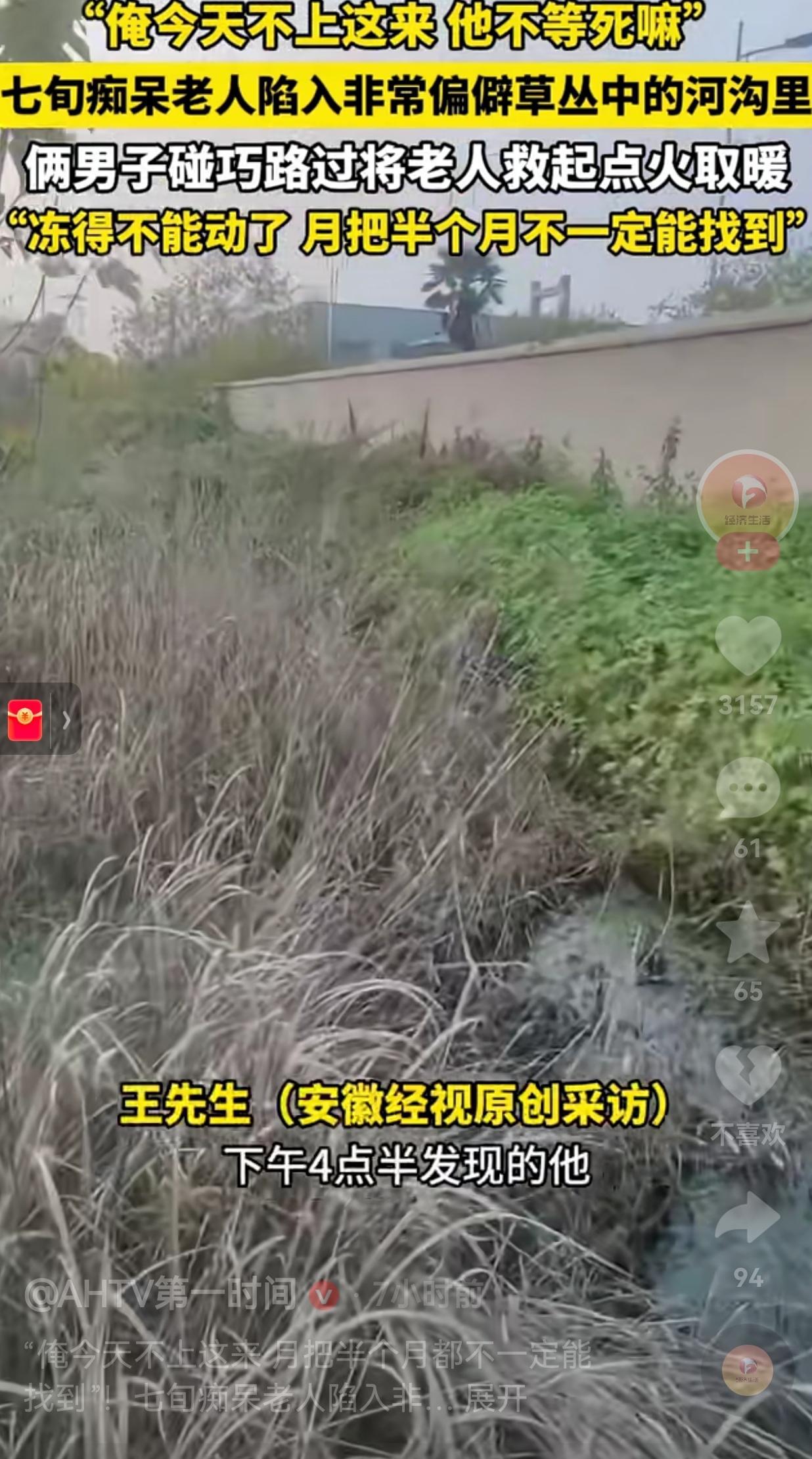真的是不幸中的万幸!安徽界首一七旬老人老年痴呆,早上起来就走了,由于什么都不知道了,什么也记不得了,四肢也不协调了。他竟然不走平常路,顺着偏僻的草丛走路,不幸的是,走着走着就陷入河沟里了! 老人挣扎着站起身来,老胳膊老腿挣扎了很久,最终,也没有站起身来,只能在那里躺着。 家人发现老人不见了,也在费力寻找,可是,没有找到。 老人也挺幸运的,下午四点钟两名男子路过此地,发现河沟里有一位年迈的老人。这个时候,老人浑身已经湿透了,冻的直哆嗦。 男子见状,一点也不敢耽搁,赶紧将老人扶起,并点火给老人取暖。接着,男子打了报警电话,民警和当地村干部联系,通知老人的家人,成功将老人安全送回了家。 老人找到后,由于老人的儿子已经去世,老人家的儿媳妇特意带着礼物来到男子的家里表示感谢。 网友看到后评论说,这儿媳妇做的真不错,说明老爷子家里人对儿媳妇绝对可以。 还有的网友说,人不该死,必有人救!关键是得遇上好心之人! 老爷子是不幸的,因为,得了这种病,什么都不知道了,才遭此横祸。但是,老爷子又是幸运的因为,这种概率太低了,还被他碰到了。万一真的没有人途经此地,后果真的不堪设想!很可能就没命了。 通过这件事情,也给所有的为人子女提个醒,照顾这种痴呆老人可得时刻留意,实在不行就把他栓在家里吧?这也比让老人乱溜达强的多。 大家觉得呢?欢迎大家评论区讨论留言。