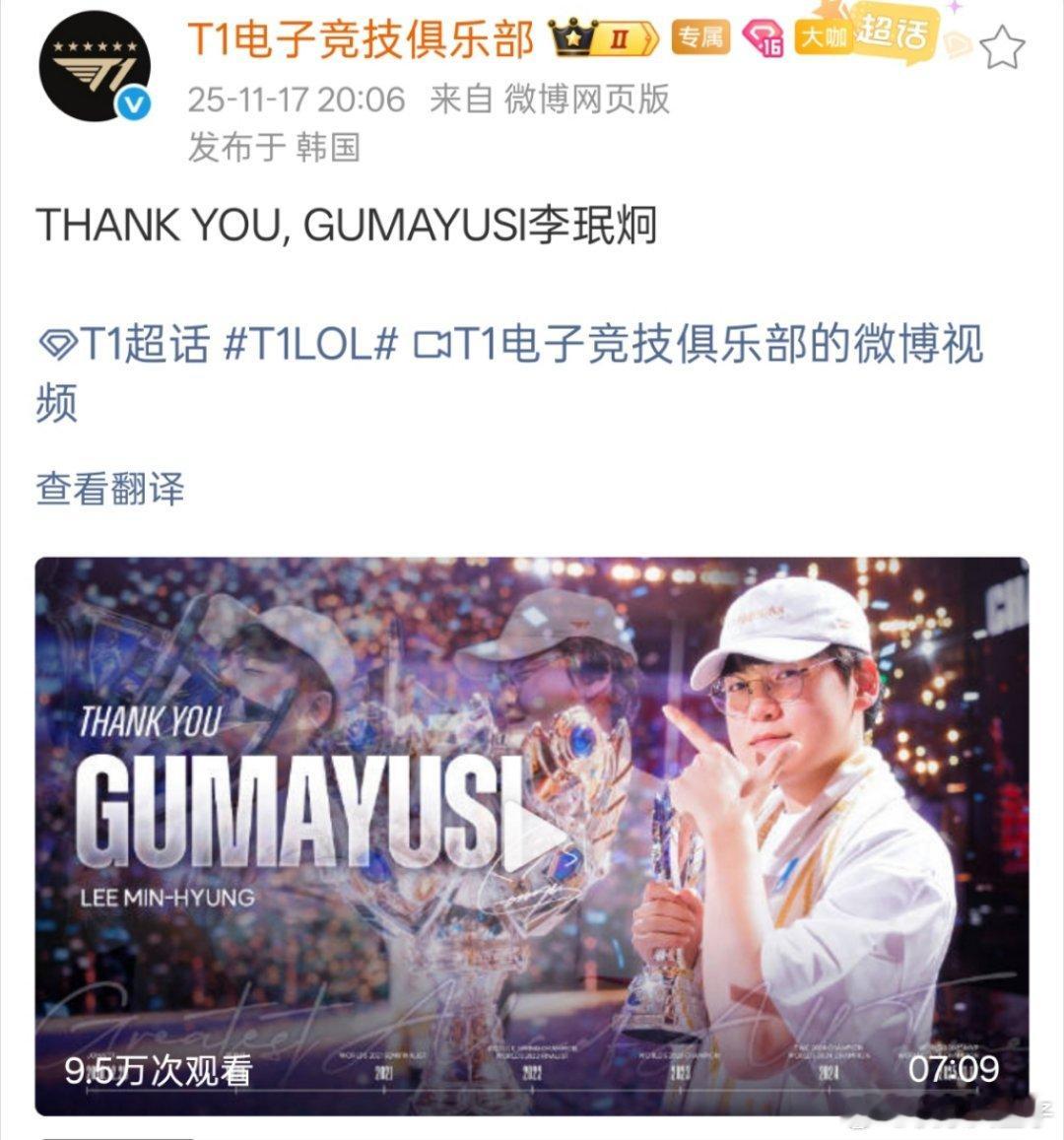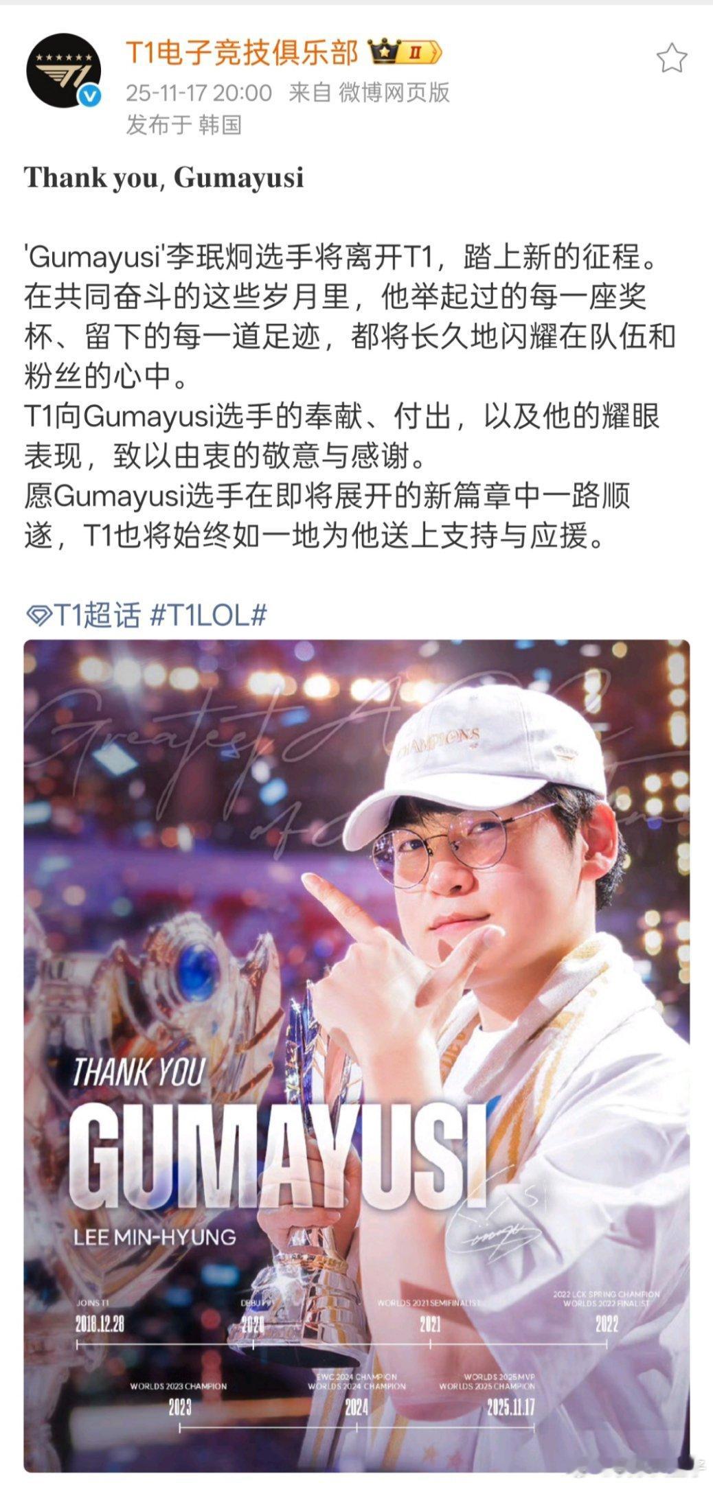 Gumayusi做到了但T1没做到,FMVP离队,T1做了一条七分钟视频,就这么跟三连冠ADC告别了。
