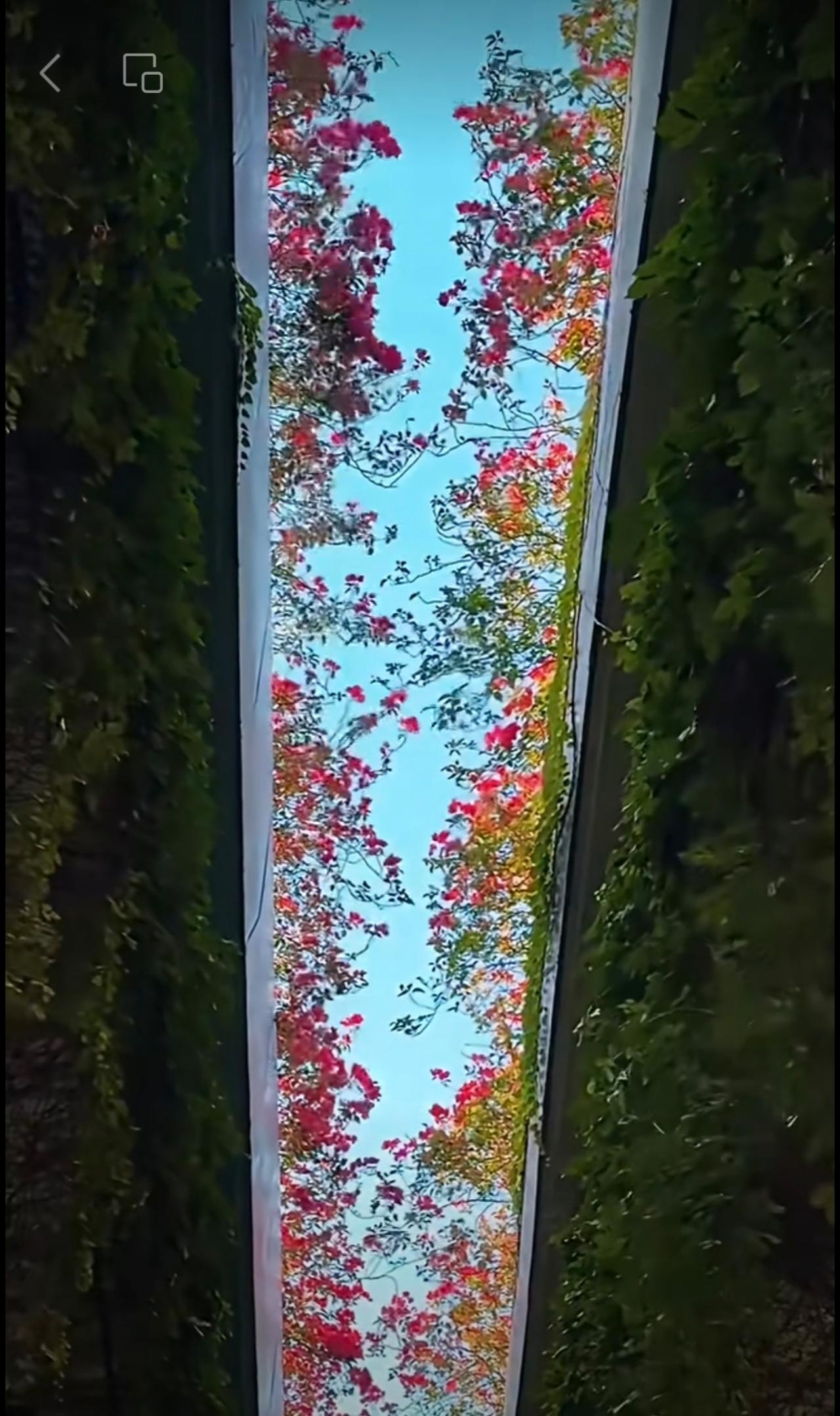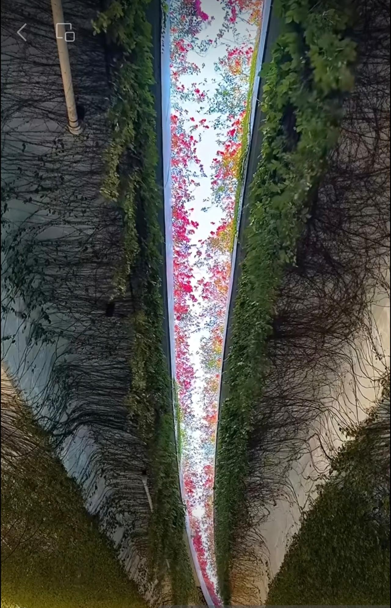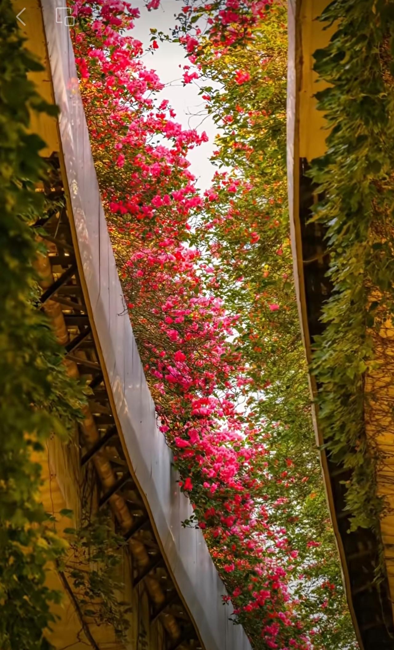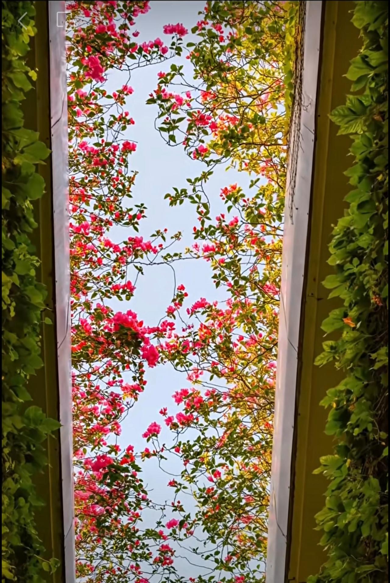 第一眼看似乎像一幅美丽的水彩画,色彩鲜艳。然而,仔细看完发现,这其实是一段高架桥下方的景观,桥底密密麻麻的藤蔓植物装饰了整个桥面,形成了自然的绿色和红色植物的线条。顶部的蓝天和藤蔓的红色花朵交织在一起,形成了一幅非常美丽的天然画面。 这种巧妙结合自然和建筑的设计,给人一种艺术与自然融合的感觉,的确初看会让人以为是水彩画!