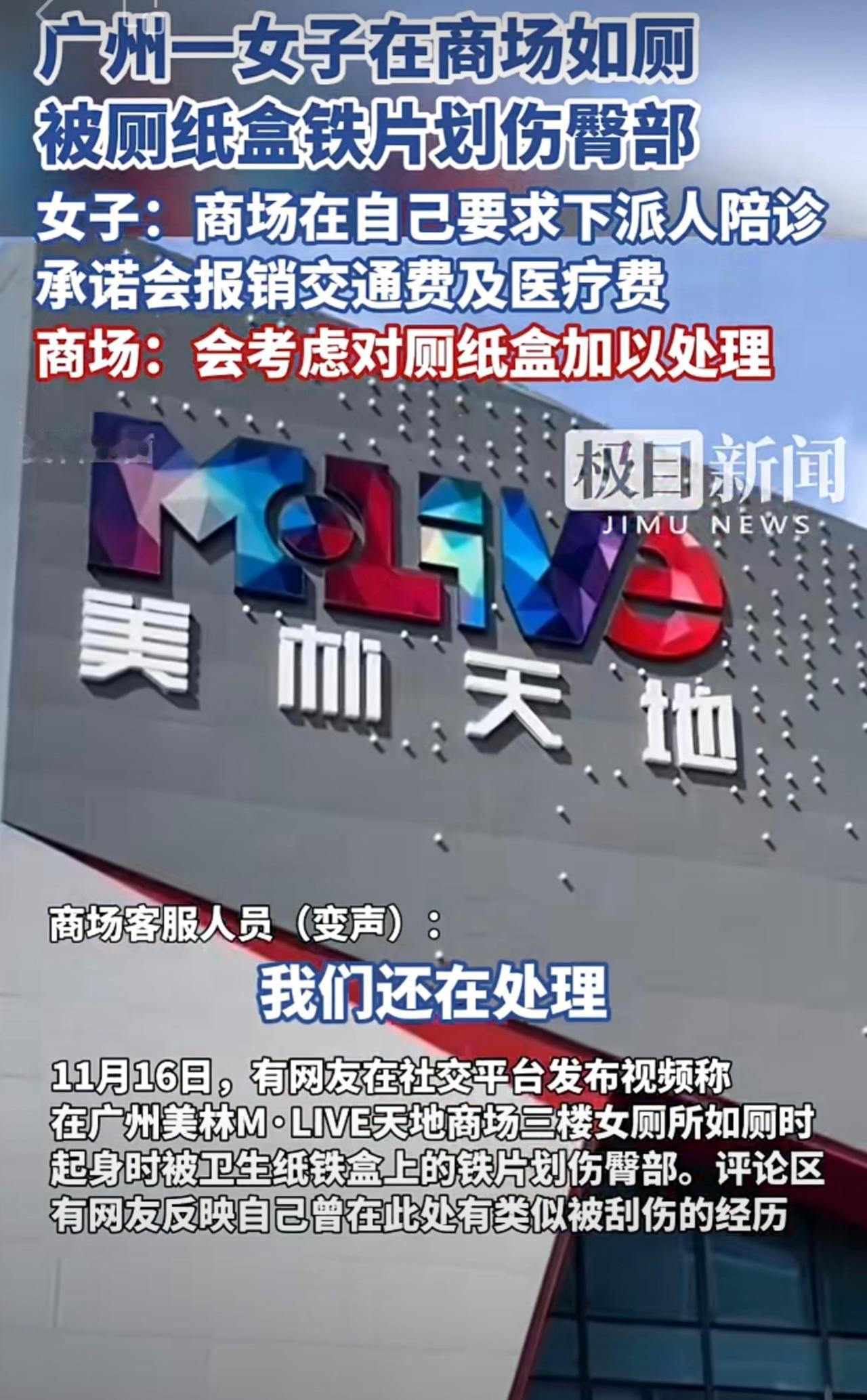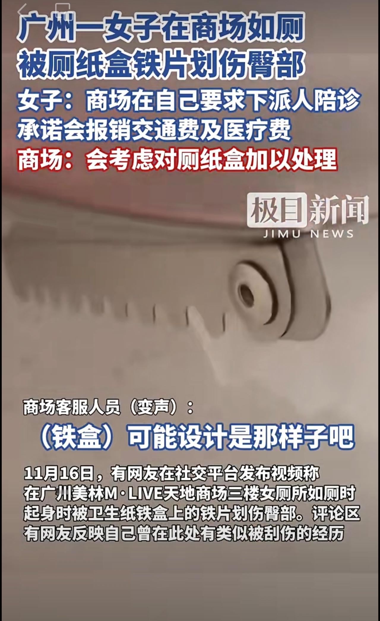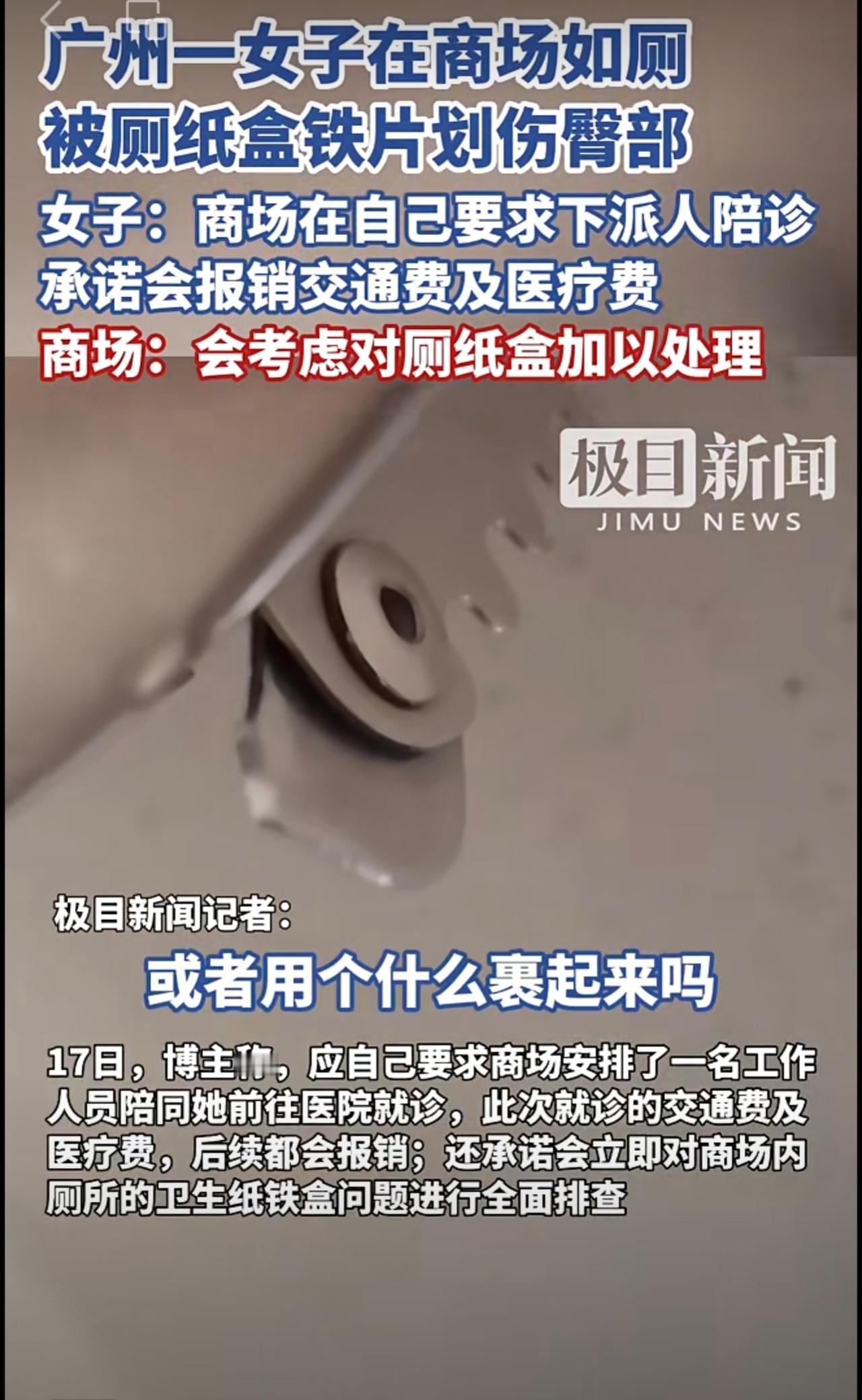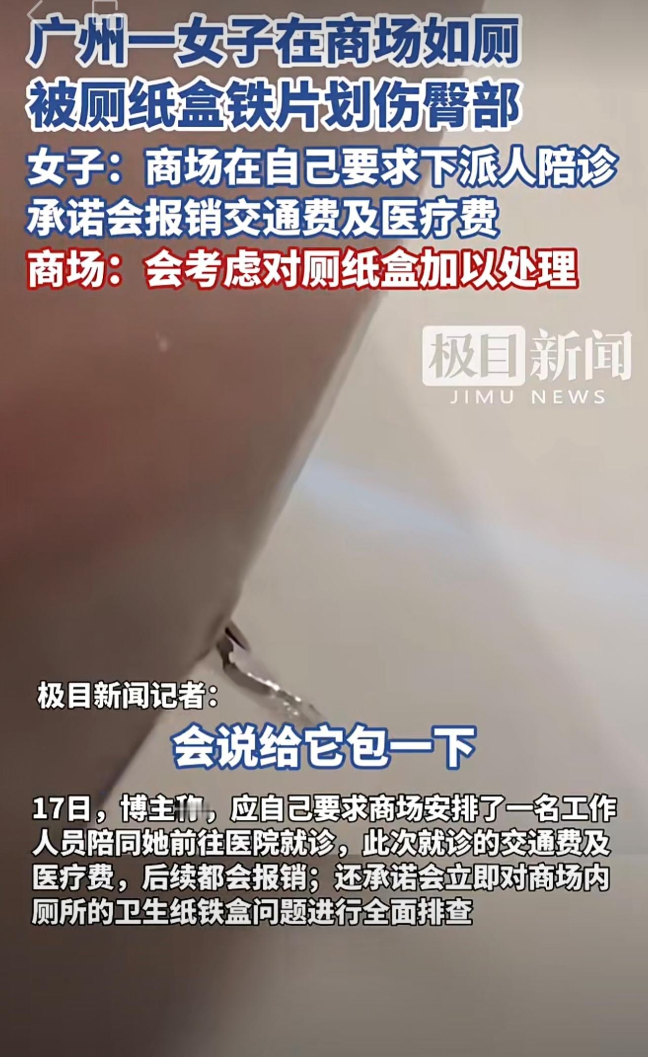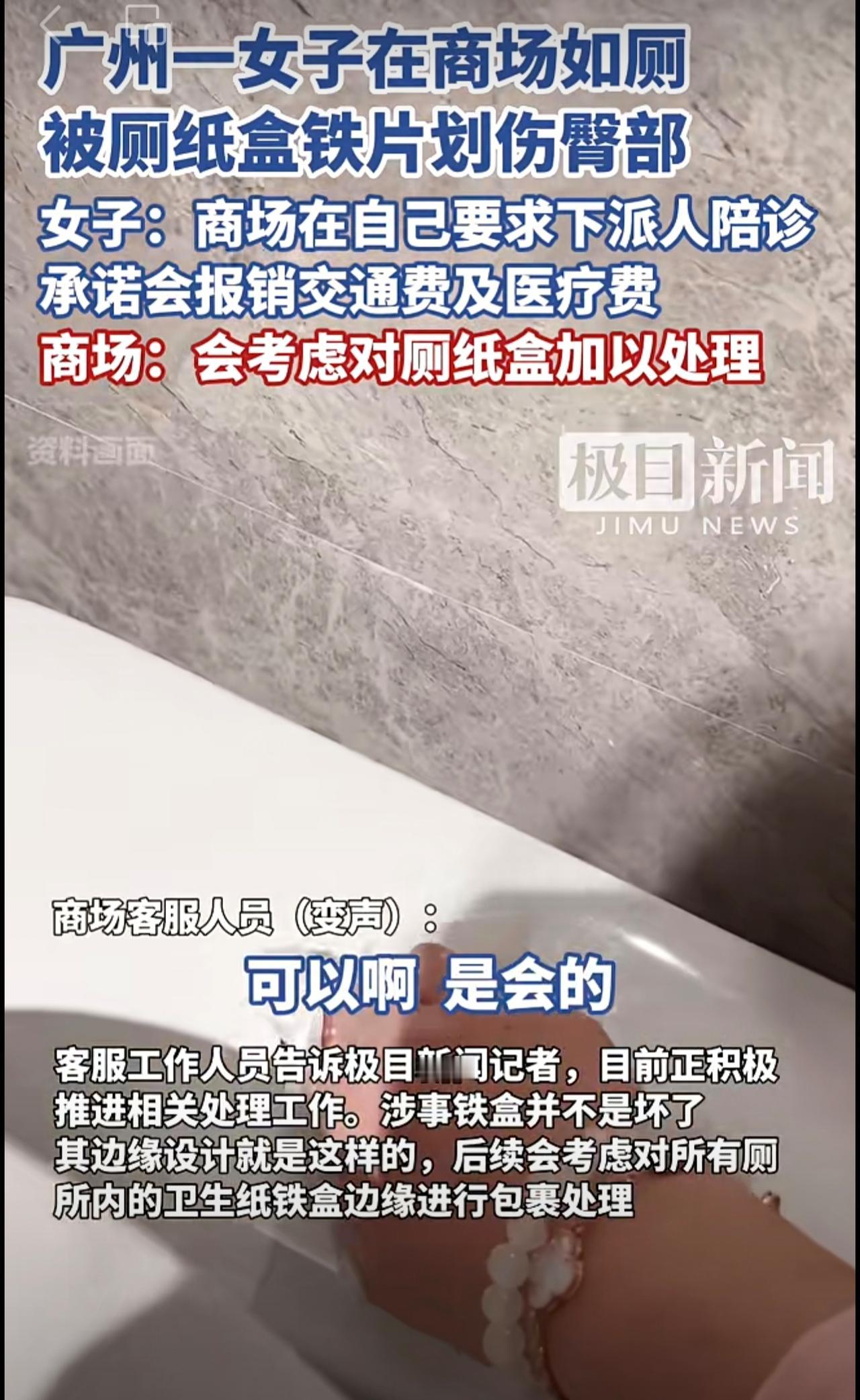 广州一女子在商场如厕被厕纸盒铁片划伤臀部,女子:商场在自己要求下派人陪诊,承诺会报销交通费及医疗费,商场:会考虑对厕纸盒加以改进。