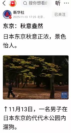 正当全国人民都在批斗日本首相高市早苗之时,新华社突然发了一组日本东京代代木公园的图片,这是什么意思?实在令人难以费解! 说白了这组代代木公园的图片根本不是随便发的,就是借着秋日景象藏着四层深意,还暗戳戳用《终结者》的核爆镜头敲警钟,把话都埋在画面里了! 秋天到了这话听着普通,可放在东京代代木公园的图景里就耐人寻味了,你看新华社发的图里,金黄的银杏叶铺了满地。 金黄银杏叶美得让人心颤,可秋日绚烂之后便是万物凋零。这组图片发布于中日关系敏感时刻,犹如一记绵里藏针的巧妙回应。代代木公园绝非普通绿地,它紧邻日本皇居,曾是皇宫一部分,这片土地承载着特殊的历史记忆。 图片里遛狗市民和演奏乐器的女子看似日常,却让人想起《终结者》里核爆前的宁静假象。卡梅隆用最真实的镜头语言展现过末日景象,那种震撼远比特效更刺骨。此刻东京公园的平和画面,仿佛在提醒某些人:灾难来临前,普通人的生活也是如此岁月静好。 “秋意盎然”四个字藏着东方智慧里的玄机。中国民间常说“秋后的蚂蚱蹦跶不了几天”,古人执行刑罚也多在秋后。这组图片既展现落叶之美,又暗示凛冬将至,像温家宝总理当年在此打太极般刚柔并济。 代代木公园不仅是休闲场所,更是日本社会百态的缩影。这里举办过反对核污水排海的市民集会,也见证过中国领导人的友好访问。如今银杏叶依旧金黄,某些人却忘了历史教训。 某些日本政客应当明白,中国人对统一的执着如同美国南北战争的情感共鸣。邓公当年用这个比喻让美国政客哑口无言,今天这组秋景图也在诉说同样决心:我们追求和平,但从不畏惧凛冬。 这组图片的妙处在于,它既展现了普通日本民众的生活状态,又暗含了历史与当下的交织。正如代代木公园里既有休闲的市民,也有过往的历史痕迹,这或许提醒人们,在关注政治风云的同时,不应忽视生活本身以及历史的镜鉴。 真正的底气不是声嘶力竭的呐喊,而是这种举重若轻的从容。就像代代木公园里那片银杏林,年年秋色如画,却从不在意谁在树下驻足。中国的态度就藏在落叶沙沙声里:该来的总会来,该走的留不住。 各位读者你们怎么看?欢迎在评论区讨论。