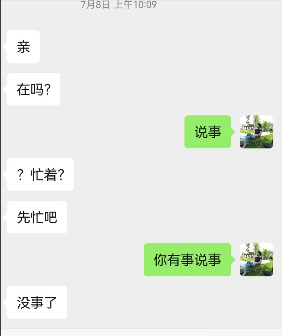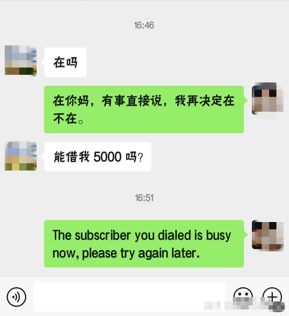 微信上问"在吗"的人,到底想干嘛?真相太扎心! 最烦微信上突然蹦出"在吗"俩字!🤬 回"在"吧,怕对方来借钱的 回"不在"吧,又显得太虚伪 这种开场白,99%没好事! 网友说得太对了: 陌生人问"在吗"=要你帮忙/借钱/随份子 熟人间问"在吗"=我闲得蛋疼快来唠嗑 你回个"说事",对方立马怂成狗—— 成年人的默契:不直接说事=事不好说 要我说啊: 真想找人帮忙就痛快说事 别玩"在吗"这种心理试探 大家都是手机长手上的现代人 谁还不知道你盯着屏幕等回复?📱 高情商操作: "在吗?想跟你借2000交房租" "在吗?能帮我孩子投个票吗" 直接说事!对方能帮就帮,不帮也好拒绝 别用"在吗"浪费彼此时间,真没空猜谜! 微信社交礼仪 成年人沟通