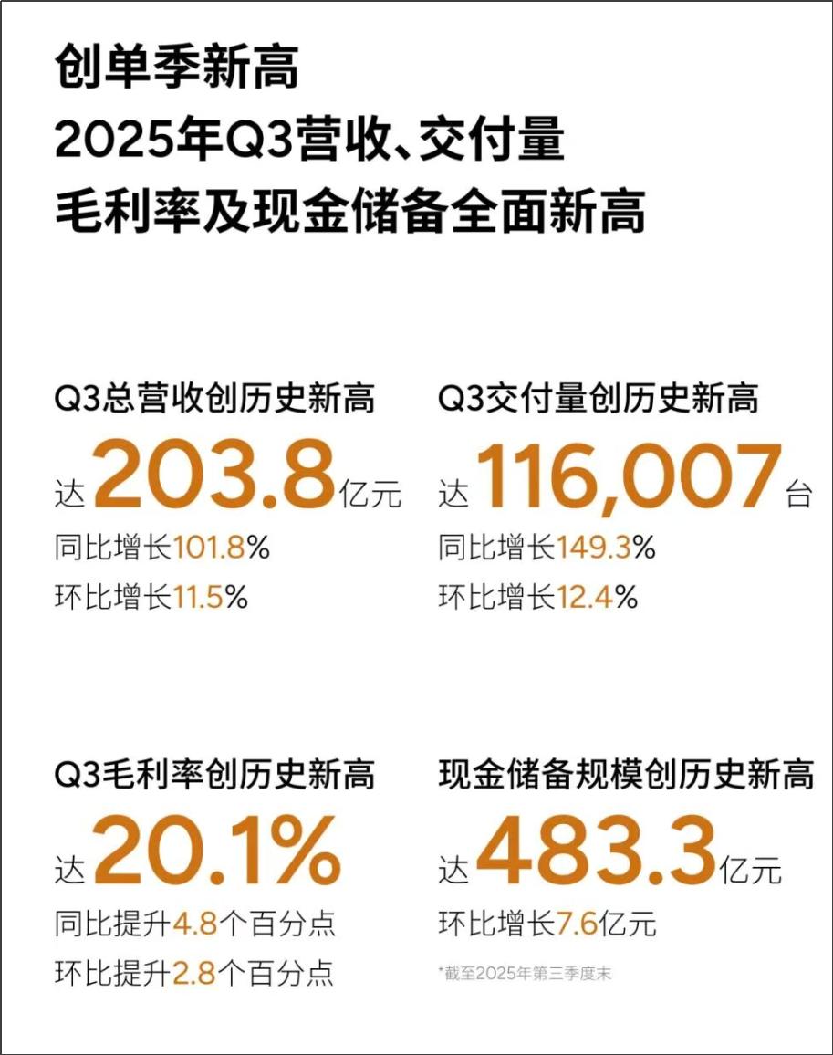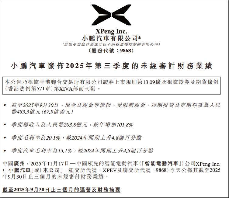 新势力当中,理想汽车2023、2024连续两年盈利;赛力斯2024年实现首次全年盈利;零跑上半年实现利润转正,三季度连续盈利(1.5亿)……小鹏也快了!? 11月17日,小鹏公布第三季度业绩,Q3财报数据显示:小鹏汽车三季度收入为203.8亿元,同比增加101.8%。其季度毛利为20.1%,同比上升4.8%,达到历史性高点;汽车毛利率为13.1%,同比上升4.5%。 这么高的毛利率?要知道,小鹏的服务及技术研发收入营收达23.3亿元(小鹏和大众集团有深度合作),毛利率高达74.6%,这是拉动综合毛利率的重要支撑。 利润方面,小鹏季度净亏损为3.8亿元,较去年同期大幅缩窄79%。公司现金流状况稳健,截至9月30日,现金及等价物等储备达483.3亿元,较上一季度增加了7.6亿元。 按照小鹏汽车第四季度业绩指引,预计汽车交付量将达125000至132000辆,同比增长36.6%至44.3%;总收入预计介于215亿元至230亿元,同比增幅33.5%至42.8%。 小鹏汽车董事长兼CEO何小鹏在业绩解读中强调,公司各项关键经营指标已再创新高,随着销量规模扩大与成本控制深化,盈利拐点正在临近,目前市场也普遍看好小鹏汽车将在四季度达成盈利。【来自懂车帝车友圈】