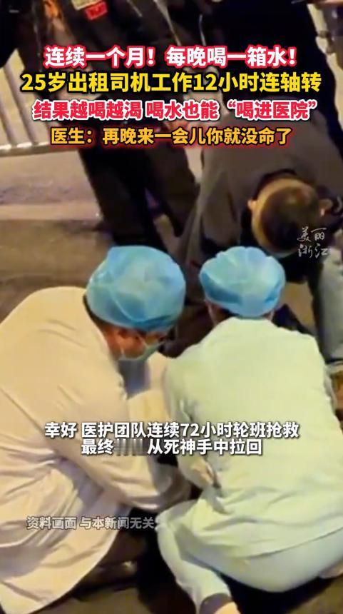 “有命挣,没命花!”11月12日报道,福建,一位25岁出租车司机经常觉得口渴,开始他还没在意,可后面这种感觉越来越强烈,甚至一晚上要喝一箱矿泉水,持续一个月后身体到底出现了问题,送医后确诊多系统危重症。 医生:再晚来可能没命。 时间拉回 2024 年夏天,23 岁的杨先生刚考到出租车驾照。 他攥着方向盘,盯着计价器心里盘算:“每天多跑两小时,年底就能攒够首付。” 为了抢单,他早上六点出车,凌晨一点才收工,每天待在车上 19 小时。 早餐是路边摊的肉包加油条,午餐晚餐全靠外卖,炸鸡汉堡是常选。 开车犯困时,他就拧开冰奶茶灌下去,一天最少喝四杯,说 “甜的提神快”。 2025年初,杨先生发现体重飙到 200 斤,腰颈时常发酸。 同事拍着他的肩膀说:“咱这行久坐易患腰椎病,你得抽空动一动。”他揉着腰笑:“等赚够钱就歇,现在哪有时间锻炼。” 那时他还不知道,出租车司机高血压患病率高达 25.78%,远高于普通人。 为了少上厕所,他甚至刻意少喝水,憋尿成了常态。 11月,身体先发出了预警。 晚上收车回家,他刚喝完整瓶水,渴意又涌上来,一晚上要喝十瓶。 起夜七八次,第二天开车眼皮打架,只能靠更多奶茶提神。 没过几天,腹痛袭来,像有刀子在肚子里搅,呼吸也变得又深又快。 妻子劝他去医院,他总说 “小毛病,过几天就好”,依旧硬扛着出车。 很快灾难突然降临。 杨先生在路口等红灯时,眼前一黑,方向盘差点脱手撞上前车。 他摸出手机想求救,却发现手指发颤,连号码都按不准。 路过的同事赶紧把他送医,急诊室里,护士闻到他呼气有烂苹果味。 医生看了血检报告拍桌:“血糖是正常值 5 倍,酮症酸中毒,多器官衰竭!” ICU 的灯光亮了七天七夜,杨先生插着呼吸机,意识模糊中全是悔恨。 医生给他做血液净化时说:“再晚来三小时,神仙也救不了,这是长期高糖饮食害的。”妻子守在床边哭:“我早说别这么拼,你要是走了我怎么办。” 第七天他终于清醒,看着输液管,第一句话就是:“我再也不拿命换钱了。” 治疗几周后,杨先生的指标逐渐正常,出院时带了厚厚的医嘱。 医生特意强调:“必须规律饮食,每天运动半小时,不然极易复发。” 回家后,他把车里的奶茶全换成矿泉水,座位旁放了腰靠护颈枕。 妻子每天给他准备杂粮饭和青菜,装在保温盒里,定时提醒他吃饭。 他调整了出车时间,下午两点停在公园,雷打不动散步一小时。 他开始在司机群里分享经历,把医嘱整理成手册打印出来。 遇到同行就递一本:“咱这行易患胃病、前列腺炎,得自己顾着自己。” 有司机按他的方法调整作息,体检时血压真的降了下来,特意来谢他。 媒体报道了他的故事,网友说 “这才是最实在的健康科普”。 现在的杨先生,每天出车八小时就收工,周末陪妻子去爬山。 他的出租车里,除了健康手册,还放着血糖仪和便携餐具。 遇到点奶茶的乘客,他会笑着劝:“甜水喝多了伤身体,温水才养人。” 他心里明白,真正的财富不是存款,是能好好活着的健康。 如今他的笑容格外踏实,这是劫后余生,更是对生活的重新敬畏。 信息来源:《25岁小伙生病一晚喝一箱矿泉水 ,而且越喝越渴。送医后被确诊为糖尿病酮症酸中毒、急性胰腺炎、肾功能不全、高脂血症等多系统危重症。医生:再晚来可能没命……》第1眼新闻