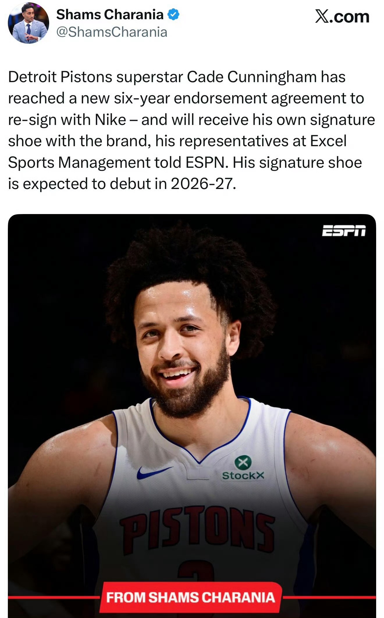 凯德-坎宁安已与耐克达成全新六年续约协议!此外,坎宁安将获得个人专属签名鞋系列,预计该系列将于2026-27赛季正式亮相。由此,坎宁安成为耐克旗下第六位拥有个人签名鞋的现役NBA球员,其余五位为勒布朗-詹姆斯、凯文-杜兰特、贾-莫兰特、德文-布克与扬尼斯-阿德托昆博。