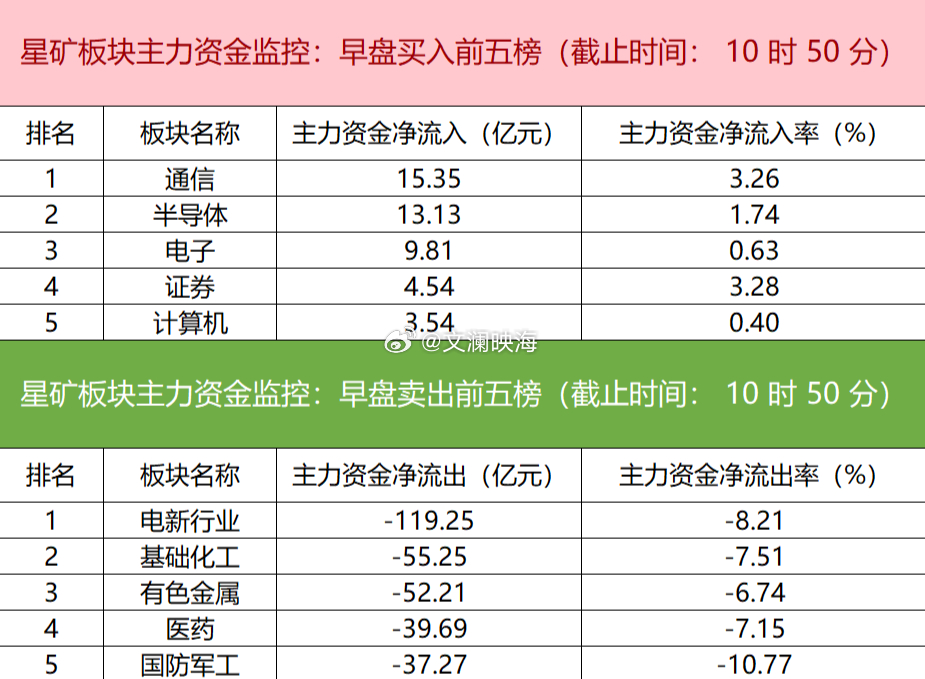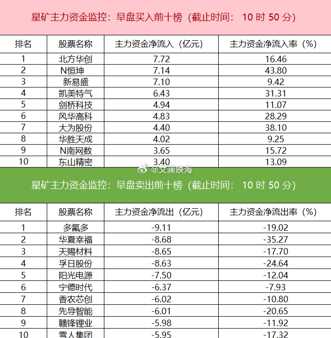 今日早盘主力资金流向呈现结构性分化。通信、半导体、电子板块获主力资金青睐,呈现净流入态势;而电力新能源、基础化工、有色金属板块则成为资金流出主要方向,其中电新行业单板块净流出规模达119亿元。从个股层面看,北方华创获主力资金大幅买入7.72亿元,位列榜首;N恒坤、新易盛、凯美特气同样获资金净流入。相反,多氟多遭遇主力大幅减持,净流出金额超9亿元,华夏幸福、天赐材料、孚日股份等个股资金净流出额居前。