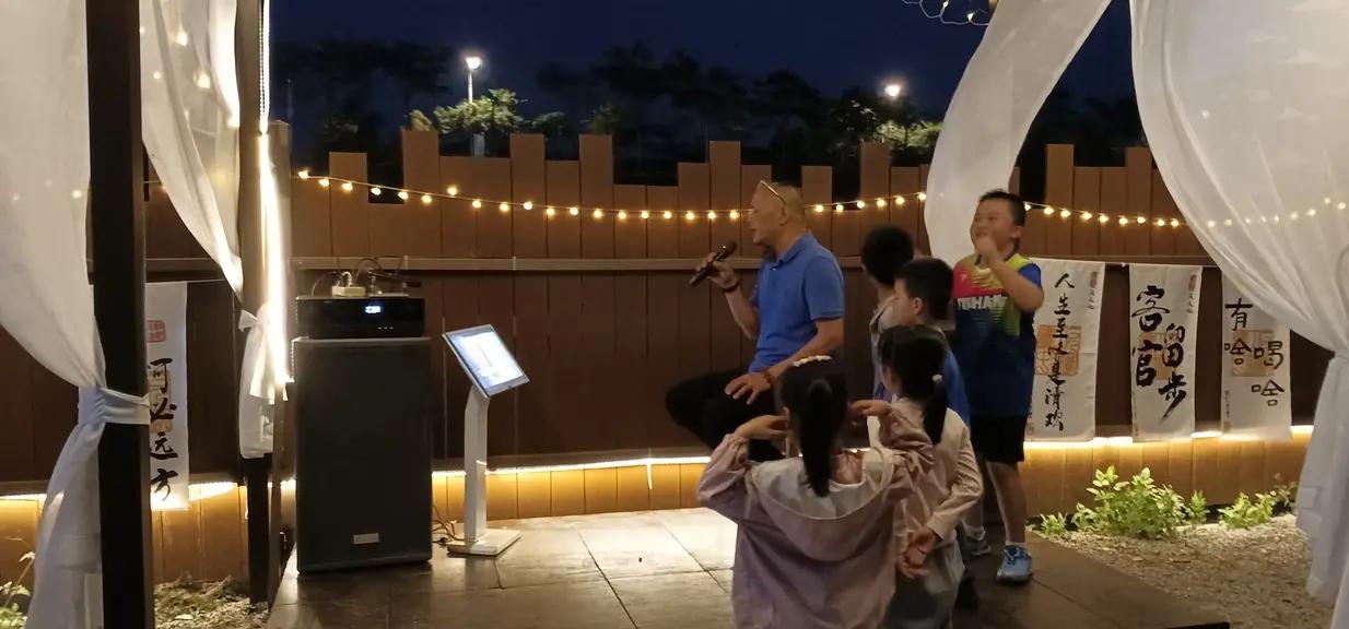 这张照片是在一处民宿夜间拍摄的,爷爷坐在昏暗KTV里面,敞开心扉,放声歌唱,几个孙子簇拥在爷爷身旁听着歌声,他们各自表情各一,中间姐弟俩全神贯注的听歌,前排靠左边的孙女嫌声量太大,两手指头塞住双耳,前排右男孙子听着听着分神了,转头看外面,后排男孩更有趣,听到爷爷把歌词唱偏了,哈哈笑个不停。