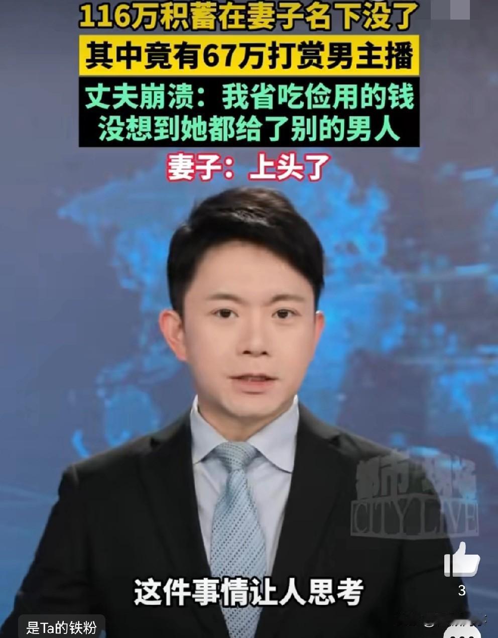 女子67万打赏男主播,是因为上头了! 116万积蓄在妻子名下没了,其中竟有67万打赏男主播,丈夫崩溃:我省吃俭用的钱,没想到她都给了别的男人,妻子淡定回应:上头了! 目前刘先生已经向平台投诉,希望追回这笔夫妻共同财产!(这样的老婆赶紧甩了,有多少钱都不够她败的...)