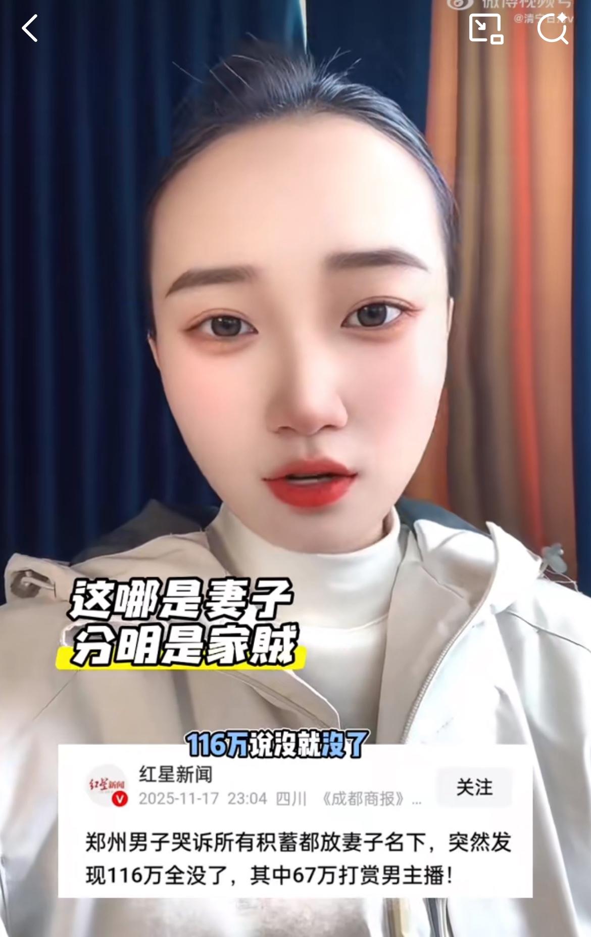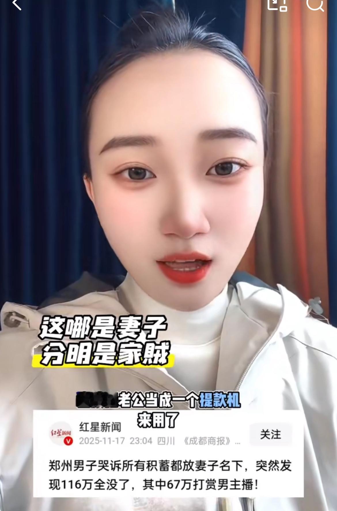 河南一家庭主妇116万挥霍一空,知道真相的老公要崩溃。男子和老婆结婚8年,老婆没上班,但是挣的钱都给老婆保管。偶然问起家里有多少积蓄,老婆支支吾吾,一查发现账户都空了,明明有一百多万啊。追问之下,老婆说打赏男主播67万,其他的钱说不上来花哪里了,还倒欠了8万块网贷。家里面谁挣钱谁保管,让一个家庭主妇管那么多钱干啥?儿媳乱花钱