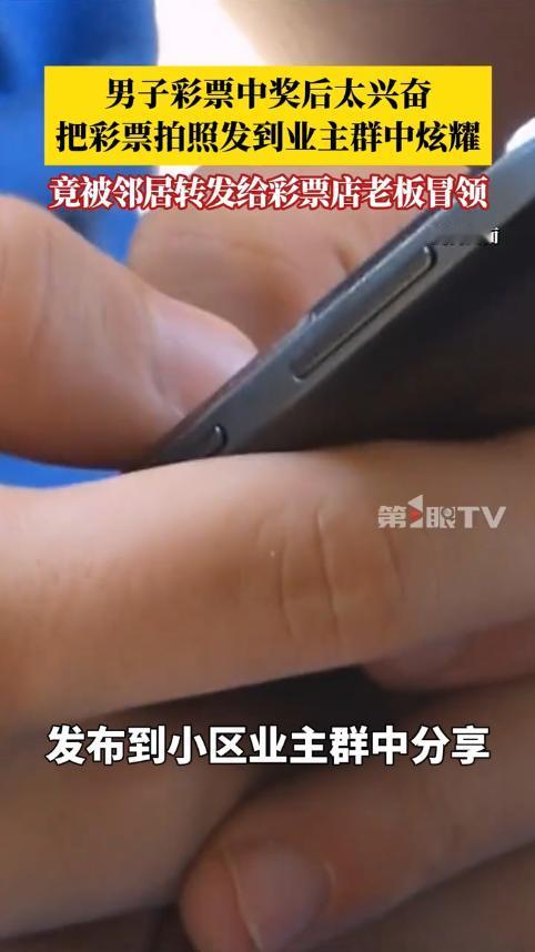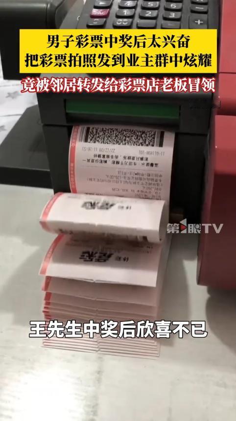 “还敢买彩票吗?”11月11日,内蒙古呼和浩特,一男子买彩票中奖后,兴奋地将彩票拍照并发到业主群里炫耀,不料,邻居看到后直接将照片转发给老板,提前将奖金领走了!网友:估计连肠子都悔青了! 买彩票中百万大奖,相信这是每一个人的梦想,但奈何这个几率实在太低,不少人买了几年,别说赚钱了,就连本钱都没赢回来。而且由于彩票是不记名的,所以一定要保管好,丢了可就没法兑奖了。 开奖的那天晚上,王先生激动地坐在电视前,看着号码一个个的公示,最终他发现自己买的彩票中了个小奖,于是迫不及待的将这个好消息分享到了小区业主群内。 邻居赵某看到后动起了歪心思,他直接将照片转发给彩票站老板,表示自己出差在外地,询问能否根据图片来领奖。 由于赵某也经常来买彩票,再加上中奖金额并不是很大,老板在确认彩票是真的后,就将奖金转给了他。 到了第二天,王先生带着彩票去领奖,老板扫描后发现这张已经兑完奖了。王先生着急的报了警,在民警的教育下,赵某意识到了自己的错误,最终将奖金还给了王先生。 网友看后表示,这回知道彩票要好好保管了吧,幸好警方找到了人,要不然这钱可就打水漂了,同时彩票店老板也要吸取教训,兑奖要有实体彩票才行! 信息来源:《男子中彩票太兴奋发业主群里,奖金被邻居冒领!》百姓关注