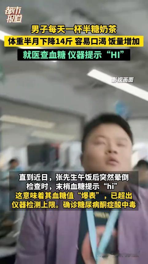 “悲剧还是发生了!”11月7日,江苏南京,一男子长期喝半糖奶茶,结果最近频繁口渴,每天要喝3升水,饭量也明显增加,可奇怪的是,体重却在半个月的时间里降了14斤!最终,男子晕倒在工位上,送医检查后,被诊断为糖尿病酮症酸中毒。 很多人都喜欢吃甜食,平日里奶茶、碳酸饮料几乎当水喝,殊不知,这样的饮食习惯非常危险,时间一长,往往就会引发糖尿病! 张先生今年37岁,虽然身高不算高,但是体重却有180斤!原来,张先生几乎每天都要喝一杯半糖的奶茶,平时饭也吃的多,运动则相对较少,久而久之,身体就“发福”了。 可是张先生并没有戒掉这个坏习惯,结果最近几个月,他总是莫名的口渴,即便猛灌矿泉水也得不到缓解。 不仅如此,张先生每天饿得也很快,吃饭时虽然吃得很多,可是体重反而降了。这天午饭后,张先生正准备出去活动活动,结果突然感觉头晕目眩,随后便不省人事了。 同事见状立马将他送去医院,医生检查后,确认张先生这是糖尿病酮症酸中毒,医生立即进行针对性治疗,努力维持血糖的平衡。 经过一段时间的治疗,张先生的病情得到了有效控制,但这病并非一朝一夕就能治好的,所以后续生活中还需注意。 张先生的事情告诉我们,大家一定要管好嘴,身体健康才是最重要的,只有养成好的饮食习惯,才能保持健康,才能拥有健康的生活! 信息来源:《37岁男子每天一杯半糖奶茶,半月暴瘦14斤晕倒工位!血糖爆表连机器都测不出》极目新闻