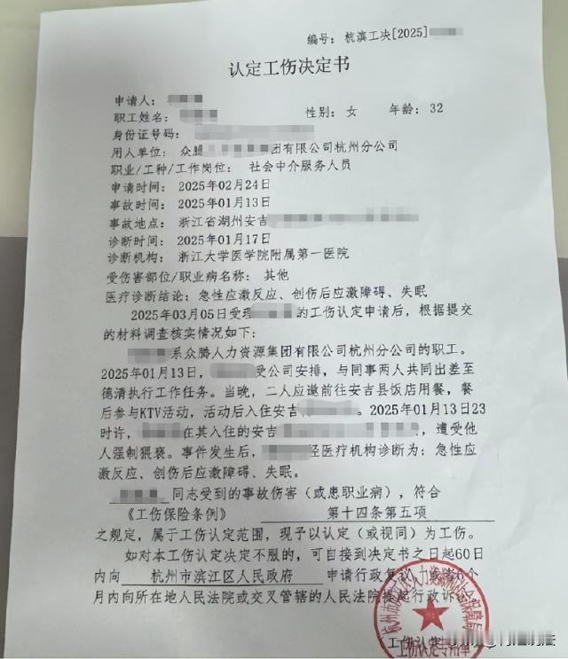 杭州,刘慧出差期间被客户强制猥亵,虽侵权人获刑,自己也获评工伤,可公司却以病假按事假处理拖欠薪资,7个月仅给400余元。无奈之下,刘慧提交劳动仲裁申请。 刘慧(化名)拿到刑事判决书后,便着手提交工伤认定申请。 可这一过程并不顺利,杭州没有专门的精神类鉴定机构,这给工伤认定带来了难题。 人社局工作人员没有退缩,他们参考首例相关案例,积极推进鉴定工作。 经过一番努力,最终确认刘慧的精神损伤属于工伤。 这一结果,让刘慧看到了维权的一丝曙光。 说起刘慧的遭遇,还得回到2025年1月13日。 那天,33岁的她随公司总经理去湖州出差,当晚聚餐时,大家喝了不少酒。 席间,男性同事们不断说着荤段子,刘慧作为唯一的女性,感到十分不适,她实在不堪忍受,便提前回了房间。 回到房间后,刘慧身心疲惫,没有反锁房门就躺下了。 谁能想到,凌晨时分,客户金某以物品遗落为由,骗得房卡进入了她的房间,并对她进行了猥亵。 刘慧从睡梦中惊醒,惊恐万分,立刻报了警。 民警介入调查,证据确凿,金某最终获刑九个月,缓刑一年三个月。 这一判决,让刘慧感到一丝安慰,可她内心的创伤却难以抚平。 案发后,刘慧患上了严重的心理疾病,整日精神恍惚,无法正常工作和生活。 公司得知此事后,态度却让人心寒。 在刘慧无法复工的这段时间,公司没有给予应有的关怀和帮助,反而提出不合理的补偿方案,让她辞职。 刘慧觉得自己在工作中遭遇了这样的伤害,公司不仅不维护她,还想甩包袱,她坚决拒绝了公司的要求。 可公司并没有就此罢休,他们把刘慧的病假按事假审批。 这意味着,刘慧在病假期间拿不到应有的病假工资。 7个月过去了,公司仅仅给她发放了400余元。 这点钱,对于需要治疗心理疾病的刘慧来说,简直是杯水车薪。 员工在工作期间遭遇了这样的伤害,公司难道不应该承担起相应的责任吗? 公司这种做法,是不是太缺乏人情味了? 从法律层面来说,员工因工作原因受到伤害,公司有义务保障其基本的生活和医疗费用。可这家公司却置法律和道德于不顾,实在让人气愤。 面对公司的种种刁难,刘慧没有选择忍气吞声。 11月14日,她提交了劳动仲裁申请,希望通过法律途径维护自己的合法权益。 公司把刘慧的病假按事假审批,导致她7个月仅获400余元,公司这种做法,违反了哪些法律规定呢? 依据《企业职工患病或非因工负伤医疗期规定》,企业职工因患病或非因工负伤,需要停止工作医疗时,根据本人实际参加工作年限和在本单位工作年限,给予三个月到二十四个月的医疗期。 刘慧因工作期间遭受客户猥亵,患上严重心理疾病,这属于因工作原因导致的伤害,符合享受医疗期的条件。在医疗期内,企业应当按照规定支付病假工资或者疾病救济费。 根据《关于贯彻执行〈劳动法〉若干问题的意见》第五十九条规定,职工患病或非因工负伤治疗期间,在规定的医疗期间内由企业按有关规定支付其病假工资或疾病救济费,病假工资或疾病救济费可以低于当地最低工资标准支付,但不能低于最低工资标准的80%。 公司把病假当事假处理,是不是在故意逃避支付病假工资的责任呢? 公司这种做法,明显没有按照法律规定保障刘慧在医疗期内的权益。 从实际情况看,刘慧7个月仅拿到400余元,这远远低于当地最低工资标准的80%。 公司这种行为,严重损害了刘慧的合法权益。 公司作为用人单位,有义务保障员工在患病或非因工负伤期间的合法权益。 在刘慧遭受工作伤害后,公司不仅没有给予关怀和帮助,反而采取这种不合理手段,实在是违背了法律规定和道德准则。 所以,从法律层面来说,公司把刘慧病假按事假审批的做法是违法的。 刘慧有权通过劳动仲裁等法律途径,要求公司补发病假工资,维护自己的合法权益。 目前,公司还没有对刘慧的仲裁申请做出回应。 刘慧已经获得了工伤认定,接下来要核算停工留薪期的时长以及相应的费用。 如果和公司协商不成,刘慧可以向劳动监察部门投诉,关键是要准备好费用依据等材料。 在这场维权中,刘慧不仅要承受身体和心理上的痛苦,还要应对公司的刁难和法律程序。但她没有放弃,她坚信法律会给她一个公正的结果。 公司在员工因工作遭受伤害后,不仅没有履行应有的责任,反而采取不合理的手段损害员工利益。 希望刘慧能早日拿到应得的赔偿,也希望这样的事件不再发生,让每一个职场人都能在安全、公平的环境中工作。
