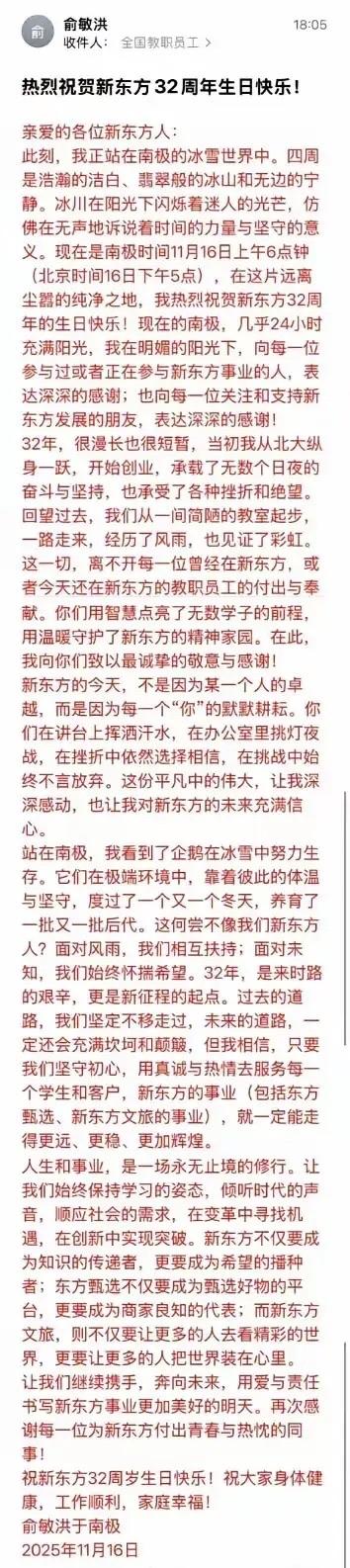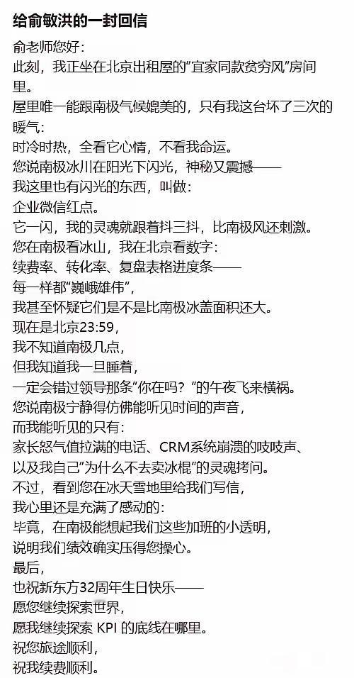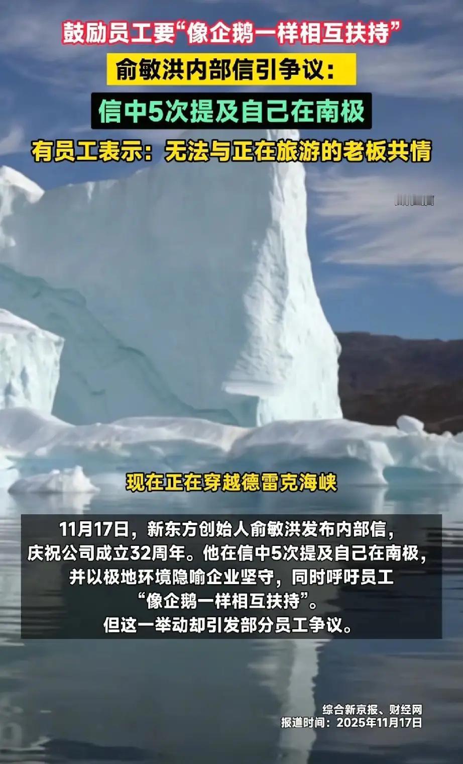 俞老师万万没想到啊! 你就是一时兴起,在南极的壮美冰川发一个全员信; 庆祝他一生的心血新东方32岁生日。 竟然被群嘲,还被员工diss,翻车了! 感觉俞老师去到南极,看到浩瀚,宁静,洁白壮美的冰川; 瞬间心中的小宇宙被激活了。 他诗兴大发,直接干出一波千字长文; 文中回忆了他创业的艰辛,并感谢了同学们的辛勤劳动; 要不是大家的坚守,他怎能有机会登上这南极之巅,享受这美好的冰川世界。 新东方在当晚加班的同事,看到之后,表示无法跟老板共情,有的气炸了。 也发出一篇战斗激情的檄文,进行了回应。 其实也没啥,就是想炫耀一下自己的创业的成功嘛; 32年,对人生来说,是将近一半了。 而且是大好年华的一半啊,对公司而言,也不短暂了。 能活到现在已经不容易,大难不死,就让他嘚瑟一下又何妨呢。 况且,他确实有嘚瑟的资本啊,很早一众跟他创业的大佬离开了。 后来,让他起死回生的小董老师,也离开了。 小孙老师,也走了,是该他表达一番创业感悟和激情梦想,有错么?
