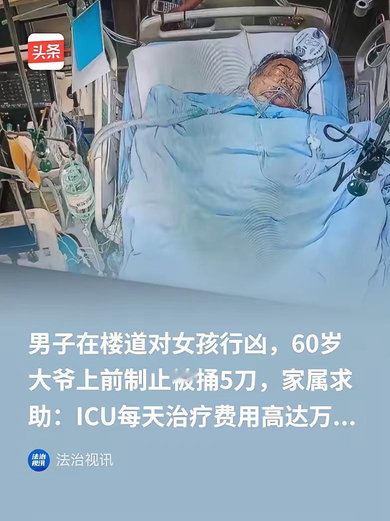 60岁大爷勇斗歹徒被捅5刀!ICU日费1万,英雄不能流血又流泪! 最动人的勇敢,从来都是普通人的挺身而出。重庆60岁的陈奎大爷,听到楼道女孩呼救,想都没想就冲上去拦凶徒,结果被连捅5刀,心脏裂伤、开放性休克,抢救7小时后至今还在ICU躺着。 凶手被刑拘,见义勇为也已认定,但每天1万多的治疗费,压得普通家庭喘不过气。网友说得对,英雄敢为我们挡刀,我们就得为他撑住腰。荣誉再高,也不如先把救命钱凑齐,真该有紧急垫付机制,别让家属一边担心亲人,一边愁着医药费。 守护英雄,就是守护我们自己的安全感。今天他为陌生人挺身而出,明天才会有人在我们危难时伸出手。 你愿意为陈大爷尽一份力吗?你觉得该如何完善机制,不让见义勇为者寒心?