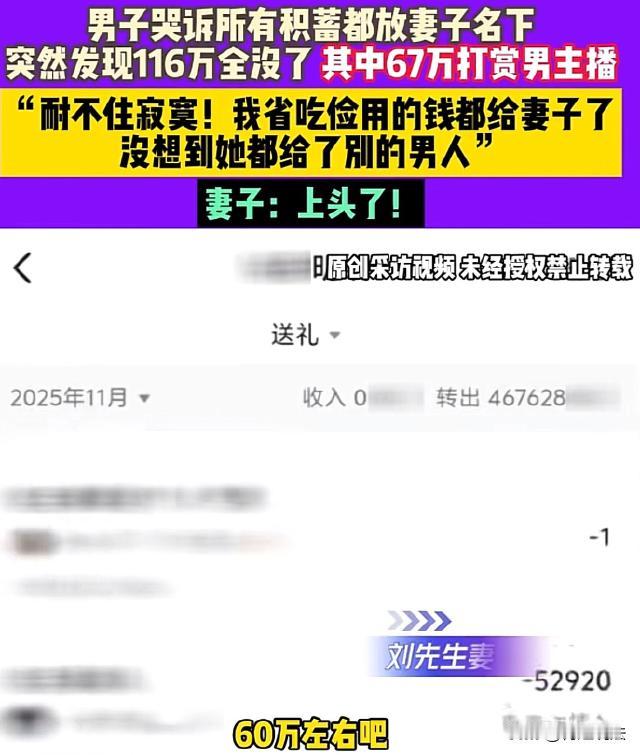 河南郑州,刘先生和妻子结婚8年了,这8年里,刘先生赚钱养家,在外面省吃俭用,连一顿好饭都舍不得吃,就想着多攒点钱,让家里能过得好一些。妻子就在家专心照顾孩子,把家里打理得井井有条。 8年下来,刘先生攒下了116万。 他把这些钱交给妻子,让妻子存了定期,想着以后孩子上学、家里也能有个保障。 前阵子,刘先生想着家里以后用钱的地方多,就想看看存款的情况。 他跟妻子提了好几次,妻子却总是找各种借口不让看。 刘先生就犯嘀咕了,这钱到底咋回事? 他越想越不安,就强烈要求妻子必须让他看存款,妻子没办法,只好把情况说了出来。 这一说,可把刘先生惊到了,钱没了不说,还欠了8万 网 贷! 刘先生追问妻子钱都花哪了,妻子后来承认,有67万都打赏给了一个男主播。 剩下的钱,她自己也说不清去向。 刘先生辛苦攒的钱,就这么轻易地被妻子挥霍了。 他怀疑妻子和那个男主播有不正当关系,这让他心灰意冷,对这段婚姻彻底失望了。 刘先生现在心里就一个想法,先追回这些钱,再谈离婚的事。 他已经联系了直播平台,希望能要回妻子打赏出去的钱。 可这事,真能像他想的那么简单吗? 刘先生觉得妻子打赏男主播的钱,都是他们夫妻共同财产,妻子没经过他同意就打赏出去,这钱应该能要回来。 而且,他怀疑妻子和男主播有不正当关系,这打赏行为就更不合理了。 而妻子觉得打赏是自己自愿的,平台和主播也没强迫她,这钱就不该还。 直播平台和男主播,他们肯定认为这是正常的用户打赏行为,和刘先生夫妻之间的事没关系。 那法律依据是什么呢? 直播打赏这事,用的是平台的虚拟道具。 用户充值打赏,其实是和平台签订了服务合同。 钱先给到平台,主播再从平台拿报酬,和用户之间没有直接的金钱往来。 所以,从一般情况来看,刘先生要回打赏的钱,应该不会被支持。 要是刘先生能证明妻子和男主播有不正当关系呢? 这就涉及到公序良俗的问题了,据《民法典》规定,民事法律行为不得违反法律,不得违背公序良俗。 要是刘先生的妻子和男主播有不正当关系,她打赏的行为就违背了公序良俗。 在这种情况下,会认定这个打赏行为无效,支持刘先生要回打赏的钱。 而且,要是妻子还私下给男主播赠与了款项,这部分钱刘先生也能要回来。 刘先生要证明妻子和男主播有不正当关系,可不是一件容易的事。 他需要收集相关的证据,要有妻子和男主播的聊天记录、视频通话记录、见面证据等,只有这些证据能形成一个完整的链条,证明他们之间存在不正当关系,才会被认可。 根据《民法典》规定,夫妻在婚姻关系存续期间所得的财产,归夫妻共同所有,夫妻对共同财产,有平等的处理权。 妻子没经过刘先生同意,就把大笔夫妻共同财产打赏出去,这本身就侵犯了刘先生的财产权益。 如果再加上能证明有不正当关系,那妻子打赏的行为就更加不合理了。 要是刘先生没办法证明妻子和男主播有不正当关系,这钱就真的要不回来了吗? 也不是完全没可能,要是刘先生能证明妻子打赏的金额,明显超出了家庭日常生活的需要,而且妻子打赏的行为严重损害了夫妻共同财产的利益,也会根据实际情况,酌情判决返还一部分钱。不过,这种情况判决返还的金额一般不会太多。 遇到问题的时候,应该坦诚沟通,一起想办法解决,而不是做出伤害对方的事。 就像刘先生和妻子,要是妻子能早点和刘先生说清楚情况,或者刘先生能多关心一下妻子的内心需求,也许就不会闹到这个地步。
