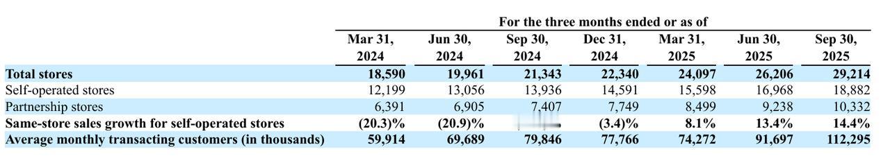 外卖大战下的瑞幸:2025Q3营收同比增长50%,净利润率8.4% 总净收入152.9亿元,同比增长50.2%。净收入增长得益于商品交易总额(GMV)同比增48.1%至173.0亿元,因运营门店和月度交易客户数量增加带动销售产品数量增长。 产品销售收入114.9亿元,同比增长46.5%。其中现制饮品净收入从72.1亿元增至106.3亿元,占总净收入69.6%。其他产品净收入从4.8亿元增至6.2亿元,占总净收入4.1%。其他净收入从1.5亿元增至2.3亿元,占总净收入1.4%。 合作门店收入38.0亿元,同比增长62.3%,占总净收入24.9%。含材料销售、配送服务费、利润分成和特许权使用费、设备销售、特许经营和其他服务费。 总运营费用135.1亿元,同比增长57.0%,源于业务扩张。运营费用占净收入比例88.4%,2024年同期84.5%,比例上升因配送费用占比上升,部分被材料成本和门店相关费用占比下降抵消。 材料成本55.4亿元,同比增长40.6%,因销售产品数量和向合作门店销售材料增加。门店租金及其他运营成本31.0亿元,同比增长35.5%,因门店和销售商品数量增加致人工、租金、水电费等成本上涨。折旧及摊销费用4.1亿元,同比增长32.4%,因门店租赁改良摊销和设备折旧增加。 配送费用28.9亿元,同比增长211.4%,因配送量激增,尤其是第三方订单。销售及营销费用7.5亿元,同比增长27.5%,因支付给第三方佣金增加,部分被广告等费用减少抵消,占总净收入4.9%,2024年同期5.8%。 一般及行政费用7.9亿元,同比增长24.6%,因薪酬、股份薪酬和研发费用增加,占总净收入5.2%,2024年同期6.3%。新店筹备及其他费用0.3亿元,同比增长103.7%,因准备开业门店增多,占总净收入0.2%,2024年同期0.1%。 自营门店门店层面营业利润率17.5%,2024年同期23.5%。 按美国通用会计准则(GAAP),营业利润17.8亿元,同比增长12.9%,GAAP营业利润率11.6%,2024年同期15.5%。非美国通用会计准则(Non-GAAP)营业利润19.3亿元,同比增长15.2%,非GAAP营业利润率12.6%,2024年同期16.4%。 所得税费用5.6亿元,2024年同期3.6亿元,因本季度利润增加。 净利润12.8亿元,2024年同期13.1亿元,净利润率8.4%,2024年同期12.9%。非GAAP净利润14.2亿元,2024年同期14.1亿元,非GAAP净利润率9.3%,2024年同期13.9%。 基本及摊薄后每股美国存托股(ADS)净收入分别为4.0元和3.9元,2024年同期分别为4.2元和4.2元。 非GAAP基本及摊薄后每股美国存托股(ADS)净收入均为4.4元,2024年同期也均为4.4元。经营活动产生的净现金流20.7亿元,2024年同期13.2亿元。截至2025年9月30日,现金及现金等价物、受限现金、定期存款和短期投资总额93.5亿元,截至2024年12月31日为59.3亿元。