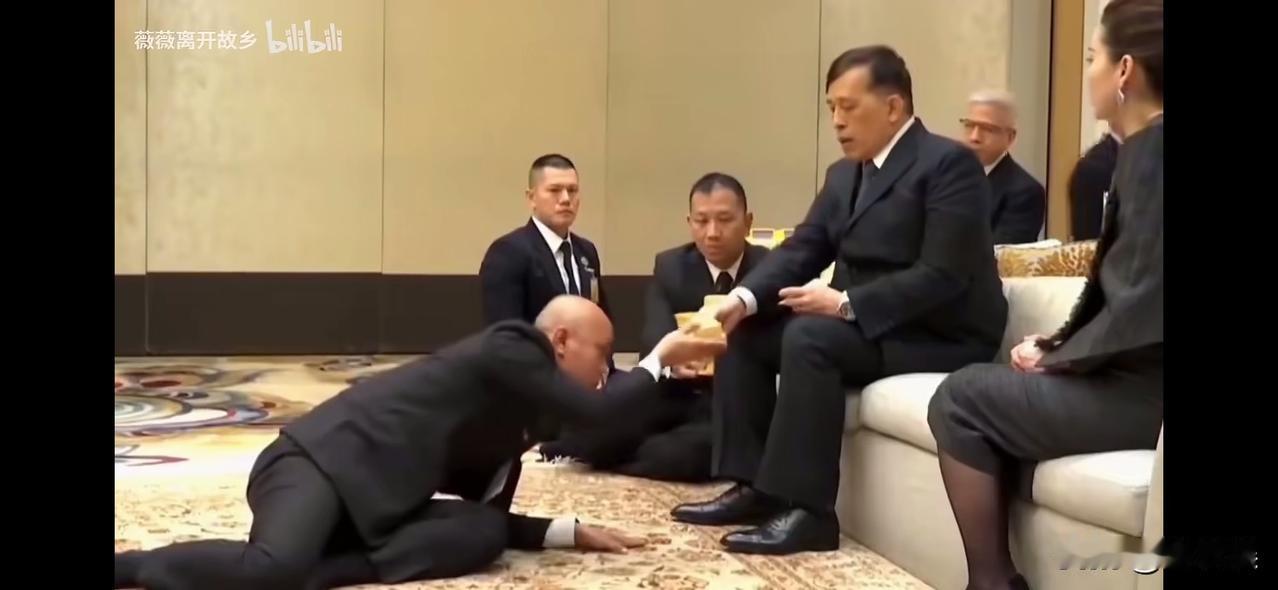 11月17日,泰国国王和王后接见了泰国驻北京的工作人员,王后苏提达换了一副新的表情。 画面中,泰国国王和王后端坐在沙发上,泰国驻京的众多工作人员坐在地上,全体人员还向国王和王后恭敬地行泰国跪拜大礼。 此时的王后苏提达不再露出这几天来在活动中那美丽亲切的外交微笑,她端坐着,嘴唇紧闭,面无表情看着她的臣民们,看起来威严无比。 从中可见,王后是万分聪明之人,懂得在什么场合配什么样的表情,才符合自己的人设和气场,她真是太强了。 国王发表讲话,感谢了眼前所有驻京工作人员对于他此次访华的出色的接待工作,他还不厌其烦,逐一给他们赠送纪念礼物。 每一位上前来接受礼物的工作人员都趴在泰王脚下,样子卑微至尘埃,但他们的表情难掩激动与荣幸! 相信这是他们此生最感荣幸最津津乐道的事了,能得到国王亲手赠予礼物! 网友看完,评论议说,这场面,很难想像这是文明进步的二十一世纪了,恍惚穿越到古代封建王朝之感,像在看明清电视剧。