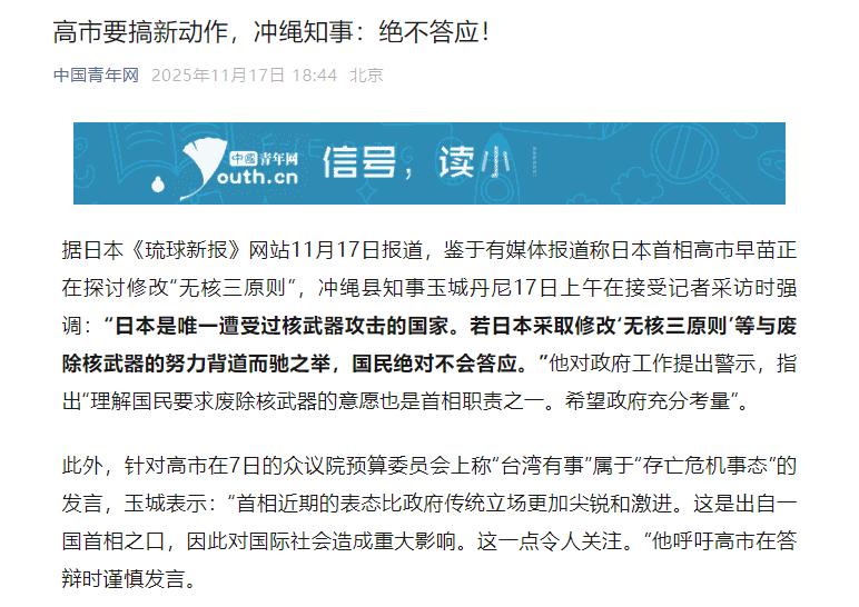 中国表态后,琉球不再忍了,点名批评日本高市早苗 11月17号接受采访时,琉球知事玉成丹尼直接点着日本首相高市早苗的名字批评,话里话外全是不认可。这一下,日本中央政府和琉球老百姓之间的矛盾,明明白白摆到全世界面前了。 玉成丹尼说得特直接:“高市首相最近说的那些话,比之前好几届政府都冲,她可是一国首相,说出来的话对国际社会影响大着呢。”这话不是随便发牢骚,每一句都戳在日本政府的敏感处。 大伙都清楚,高市早苗最近没闲着,先是在众议院预算委员会上放话,说“台湾要是出事”,对日本来说就是“关乎存亡的危机”,把地区那点事儿搅得更乱;紧接着又有媒体说,她正打算动日本坚持好多年的“无核三原则”,这事儿直接戳中了琉球,还有全日本受过核爆苦的地方老百姓的心坎子。 作为琉球的当家人,玉成丹尼生气太正常了。要知道,琉球就是日本硬改成“冲绳”的地方,二战时这儿打成了战场,战后又被美军占了好多年,当地老百姓对战争和核武器的怕,早刻在骨子里了。 而且日本是全世界唯一一个挨过原子弹炸的国家,“无核三原则”,不搞核武器、不造核武器、不让核武器进日本,早成了日本老百姓心里的安全底线。玉成丹尼直截了当地说,尊重老百姓想彻底摆脱核武器的心愿,本来就是首相该做的;真敢动“无核三原则”的主意,老百姓绝对不答应,他当场就催东京那边,可得想清楚了再干。 更有意思的是,不光琉球反对,连同样挨过原子弹的长崎县,也站出来怼高市早苗这激进的想法。长崎县知事大石贤吾17号说得明明白白:“我们这儿当年挨过原子弹,改‘无核三原则’这事儿,想都别想。”这就说明,高市早苗这冒失的立场,根本不是什么“政府战略”,而是跟全日本受过核爆苦的老百姓对着干。 值得提一嘴的是,琉球敢站出来说话,背后还有更深的老底子事儿。从历史上看,琉球以前是独立王国,还给中国明清两代朝廷进贡,直到19世纪末,被日本明治政府硬抢过去改成了冲绳县,它的法律地位本来就有争议。之前中国就有人明确说,该把“冲绳”改回原来的“琉球”,重新商量它的法律地位,这话无疑给了琉球老百姓说话的底气。 高市早苗估计也没料到,自己瞎折腾的这些话,先在日本内部引来了反弹。她一边拿“台湾出事”煽风点火,插手别人家的事儿;一边又敢碰“无核三原则”的红线,根本不管老百姓的安危。这么干,不光琉球老百姓忍不了,全世界也都看清了日本有些政客,就爱搞冒险的一套。 玉成丹尼敢说真话,说到底是琉球老百姓想守着和平,也是在反抗日本中央政府的霸道。毕竟不管是核武器的事儿,还是地区稳不稳定,都不该由几个政客说了算。要是高市早苗真听不进这些劝,还自顾自瞎搞,只会让日本和琉球老百姓的关系越来越远,在国际上也落个“破坏地区稳定”的坏名声。