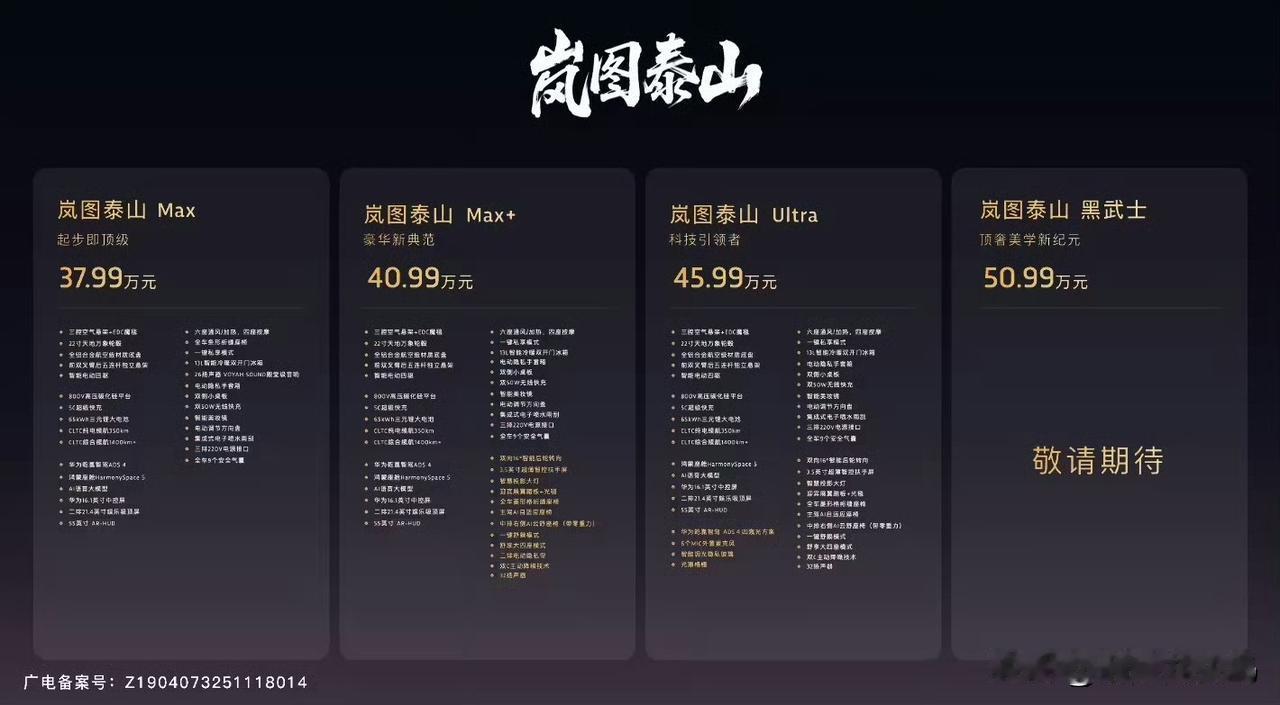 刚看完岚图泰山旗舰 SUV 发布会,价格出来啦~ Max版本是37.99 万元 Max+版本是40.99 万元 Ultra版本是45.99 万元 黑武士版是50.99 万元(明年一季度限量发售) 大家觉得这个价格如何呢