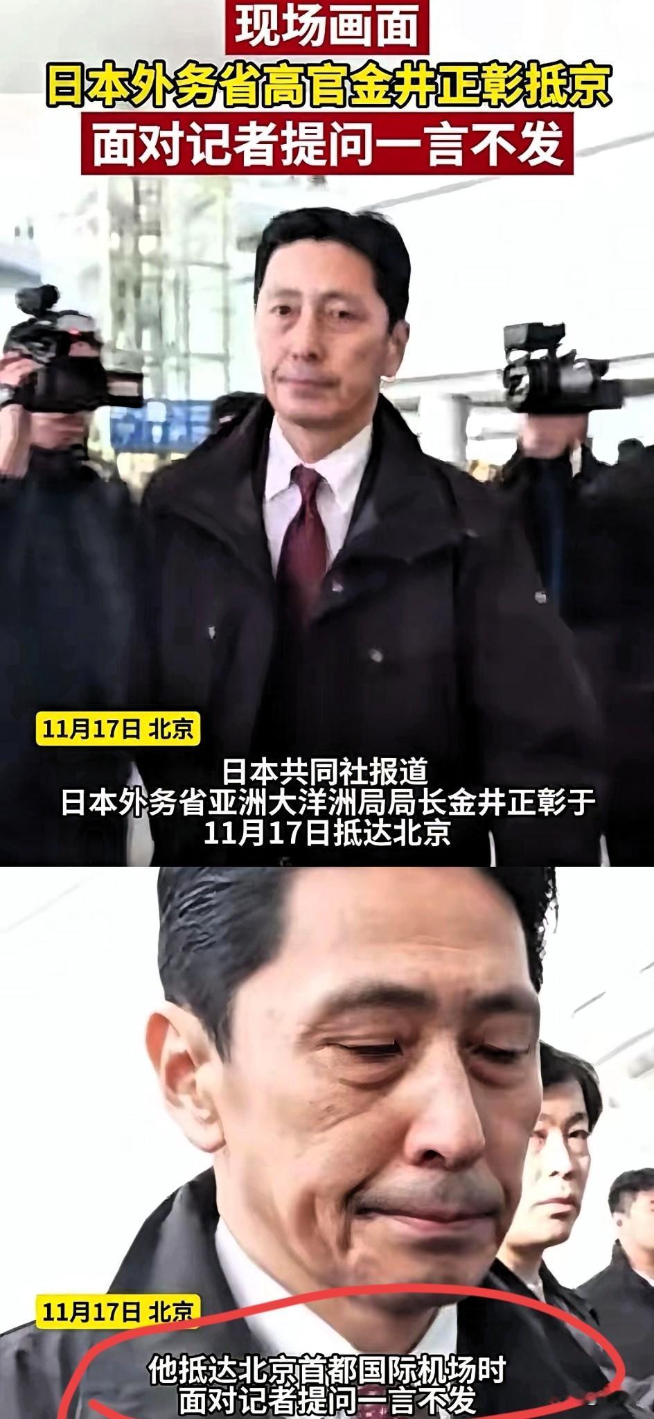 刚刚,中日会谈落幕! 日本外务省亚洲大洋洲局局长金井正彰低着头离场,全程 绷着脸一言不发,记者怎么追问都拒不回应,那模样哪儿是来磋商的,分明是没讨到半分好处的挫败样! 其实这结果早能猜到,日方压根没带诚意来,首相高市早苗的涉台错误言论拒不撤回,还派个局长级官员来“打太极”,想蒙混过关简直异想天开。 中方在会谈中直接严正交涉,把话挑明:这种触碰红线的谬论严重破坏中日关系根基,没诚意认错纠偏,谈再多都是白费。 现在的中国早不是能随便糊弄的,想一边挑衅一边求缓和?这种双标操作根本行不通! 外交不是演戏,没有诚意的沟通只会自讨没趣。 你觉得日方接下来会真的收敛,还是继续玩文字游戏?