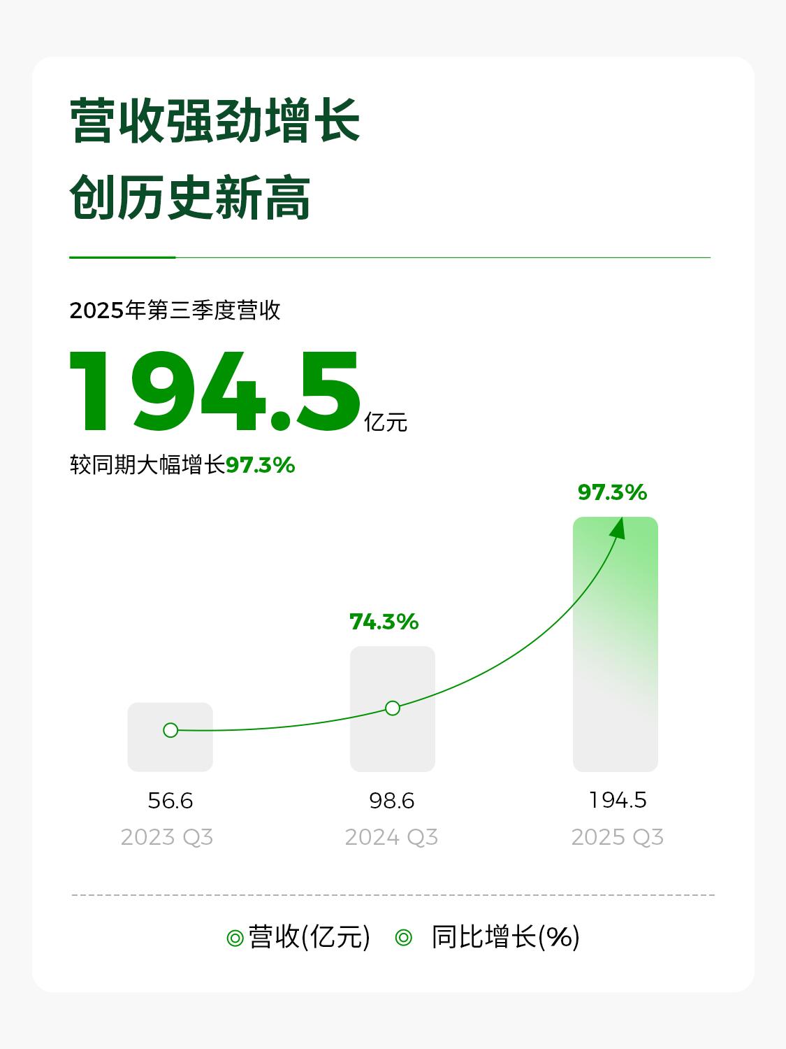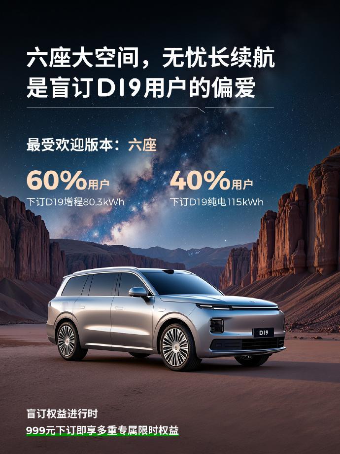 不愧是销冠!零跑三季度营收破194.5亿、旗舰D19未上市先火。 零跑今年真的“杀疯了”,不仅提前完成年销50万台目标,从日前公布的2025年Q3财报来看,零跑在三季度交付新车17.3万台,其中9月交付66657台成绩,一举刷新中国新势力月交付纪录。财务方面,零跑三季度营收超194.5亿元,交付/营收均创单季度历史新高。包括毛利率,零跑也在三季度做到14.5%,并实现连续季度盈利。 财报、销量双丰收同时,零跑在高端市场也迎来首战捷报。瞄准30万级市场的零跑D19,自11月1日盲订以来,备受家庭车主关注。从首批盲订画像来看,六座D19最受欢迎。另外,下订D19增程80.3kWh车主占比达60%,下订D19纯电115kWh车主占比40%。整体来看,车主尤为青睐纯电续航500km的D19增程版。 外观选装方面,“黑银配”是盲订D19车主的首选。同时,D19推出的双拼色也颇受欢迎,有近60%用户下订了银辉之冠拼色车顶,其中34%用户选择了金属黑+银辉之冠。显著提升气场与豪华感的21英寸“向往之境”轮毂,选装率也达63%。 目前来看,零跑D19凭借精准的产品定位与高感知配置,已初步展现出成为30万级6座SUV市场“爆款”的潜力,未来可期。零跑D19零跑汽车
