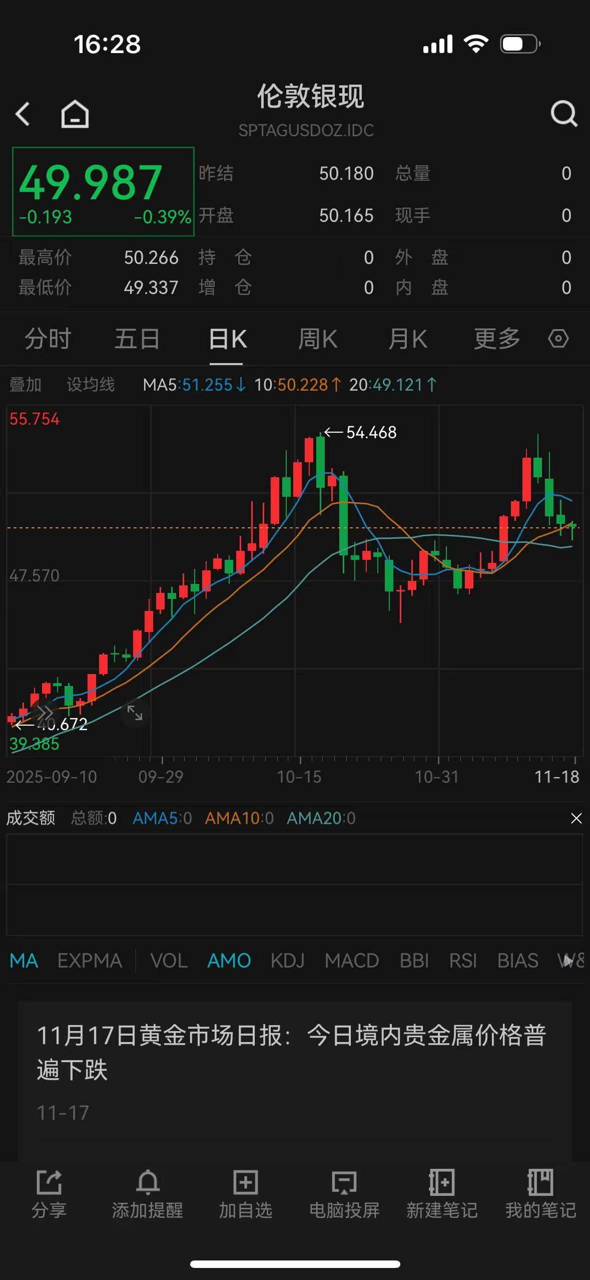 现货白银也是连跌四个交易日,11月18日,伦敦现货白银跌破50美元/盎司。