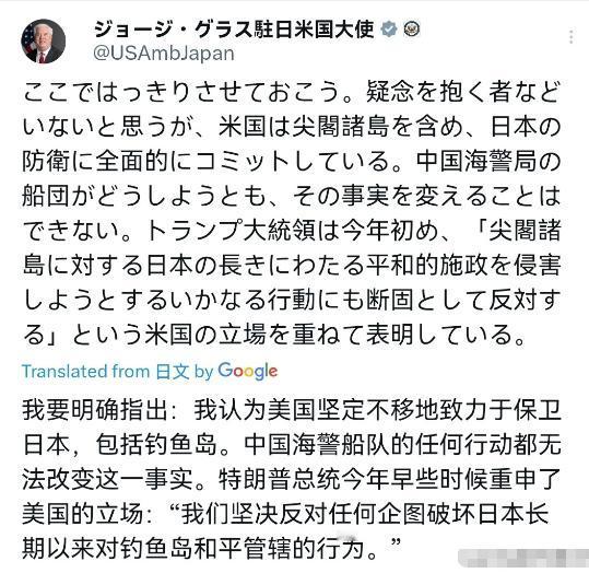 ·在我们海警船带着机炮巡航钓鱼岛之后,美国驻日大使格拉斯再次对我们放话! 11月18日,美国驻日大使格拉斯声称,是时候拨开迷雾了。如果有人还有人对此有疑问,那么我要重申,美国完全致力于保卫日本,其中包括钓鱼岛。中国海警船的编队不会改变这一点。今年早些时候,我们重申了美国的立场,我们强烈反对任何试图破坏日本对钓鱼岛长期和平管理的行动。 这位大使的话说得非常满,听起来好像只要美国一句话,我们就会被吓住一样,但有意思的地方恰恰就在这里。 当这位名叫格拉斯的大使在前线把话说得震天响的时候,他的大后方,也就是美国的权力中枢,却出奇地安静。 无论是当时主政白宫的特朗普本人,还是负责对外喊话的白宫发言人,都没有就钓鱼岛的紧张局势发表任何看法,就连一向以对华强硬著称的美国国务院,这次也选择了沉默。 那这位驻日大使的激烈言辞,到底是他自己的即兴发挥,还是真的代表了整个美国政府的统一口径?从眼下的情况来看,后者的可能性并不大。 格拉斯的表态,更像是在演一出安抚日本的独角戏,试图用强硬的措辞来给焦虑的盟友吃一颗定心丸,他的声音虽然大,但在华盛顿的一片寂静中,却显得格外孤单,甚至有些突兀。 我们不妨想一下,为什么会出现这种奇怪的局面,原因很直接,那就是我们的海警船编队,带着机炮这样的硬家伙,已经开始在钓鱼岛海域进行常态化巡航。 这已经不是简单的宣示主权,而是用实实在在的武装力量,去打破日本所谓的“实际控制”,我们的行动是果断而有力的,直接把压力给到了对方。 正是我们这种说到做到的坚定决心,才逼得这位美国大使不得不跳出来放狠话,但是,他的狠话除了听起来热闹之外,并没有得到美国更高层级的行动支持。 这就引出了一个更深层次的问题:格拉斯大使的这番表演,是否已经跟美国当前的整体战略节奏脱节了?如果美国高层正在考虑与中国进行某些方面的沟通与缓和,以处理更棘手的内部问题,那么格拉斯这种擅自加戏、煽风点火的行为,就显得非常不合时宜。 他这种看似强硬的“胡言乱语”,很可能会打乱美国高层的部署,破坏中美之间可能存在的缓和机会,一个不听指挥、自行其是的前线大使,对于任何一个大国来说都是个麻烦。 如果他真的因为自己的冲动言论而破坏了大局,那么他头上的那顶乌纱帽,恐怕就真的保不住了。