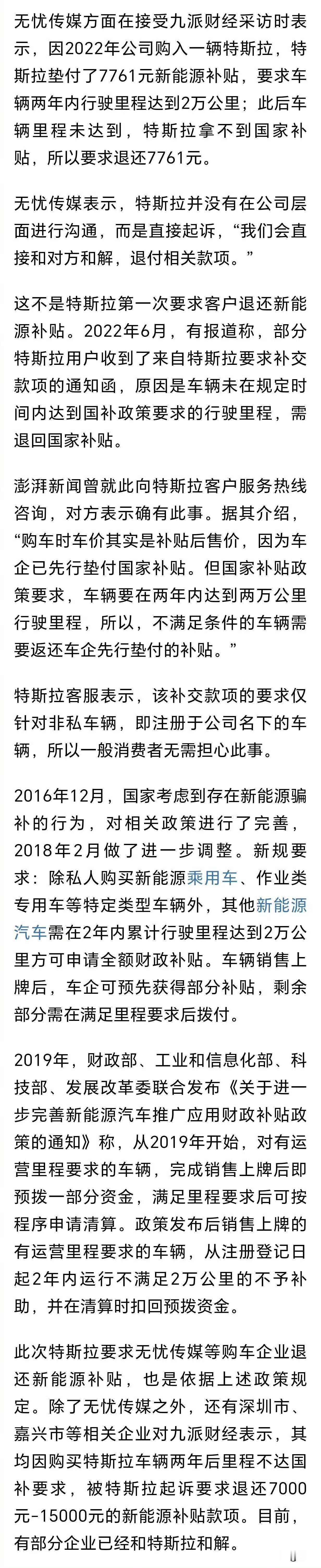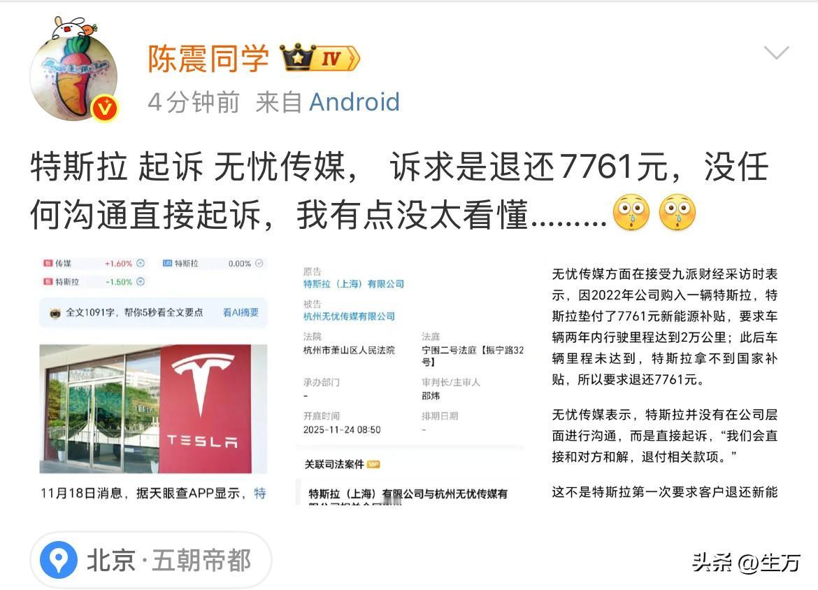 陈震: 特斯拉起诉无忧传媒, 诉求是退还7761元,没任何沟通直接起诉,我有点没太看懂[捂脸] 今天晚上,陈震找到了特斯拉与无忧传媒之间的纠葛公告详情 ,上面的关于合同方面的纠纷会在25号开庭[捂脸] 原因是要求无忧传媒退他们7000多块钱的新能源补贴[捂脸],所以陈震又贴出了后面的这个事情前因后果的一个系统报道! 按理说无忧传媒这么大一个公司,根本就不在乎这点钱,特斯拉方面给他打个招呼,这个事情也可能就解决了,但是特斯拉,选择了二话不说直接法院见[捂脸] 而且不仅仅只是他们这一家公司遇到过这种情况,根据后面的还有几家公司,但是他们比较聪明,及时的沟通与特斯拉达成了和解[捂脸] 也就是说,他们用的完全是他们那边的那套系统思维,不管是这种补贴方面的问题还是其他问题,他觉得你没有按照规定来操作,并且还在他的利益,也不管金额的大小,二话不说直接法庭见[呲牙] 所以这种操作方式和形式的方式,直接让陈震这位老司机都没有看懂,这你受得了吗?