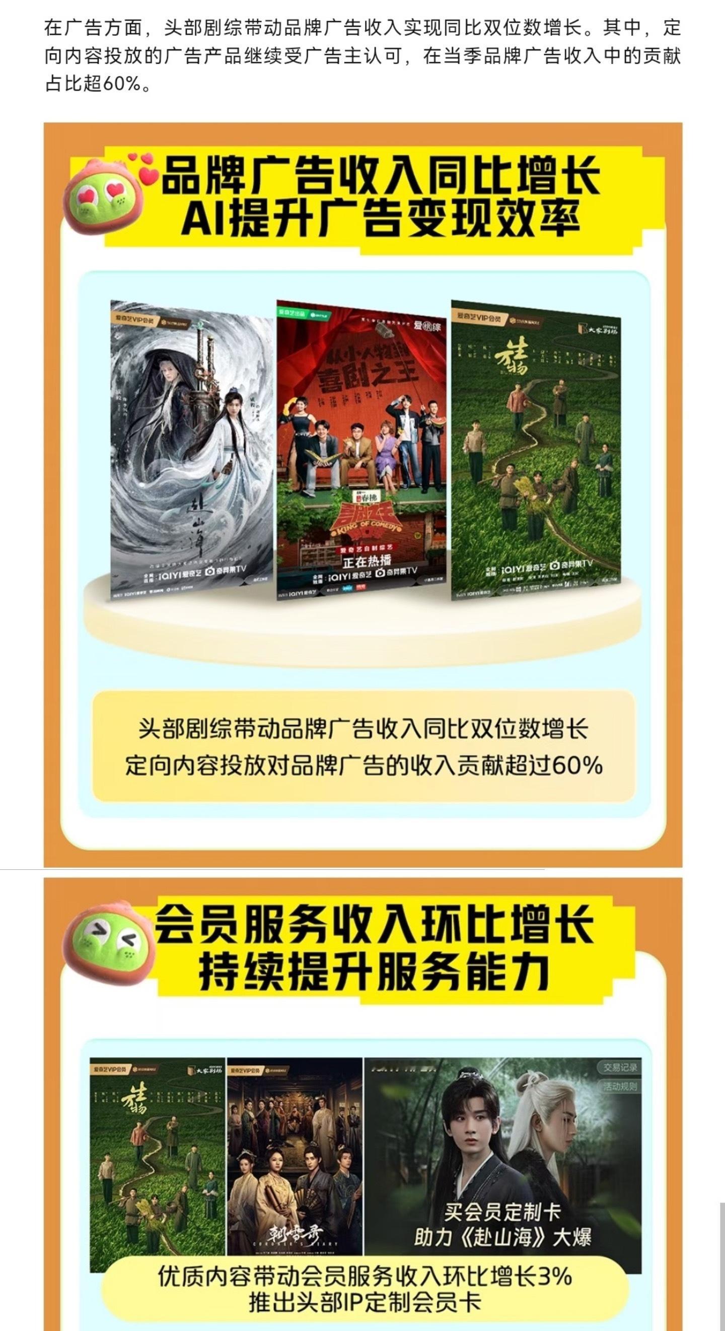 爱奇艺Q3财报:爱奇艺IP消费品整体收入同比增长超100%。重点表扬头部内容《赴山海》授权合作商家超30个,创授权业务新纪录,带飞品牌广告收入和会员服务收入❗成毅用一部剧扛起冷档期,撑起爱奇艺Q3财报,了不起。
