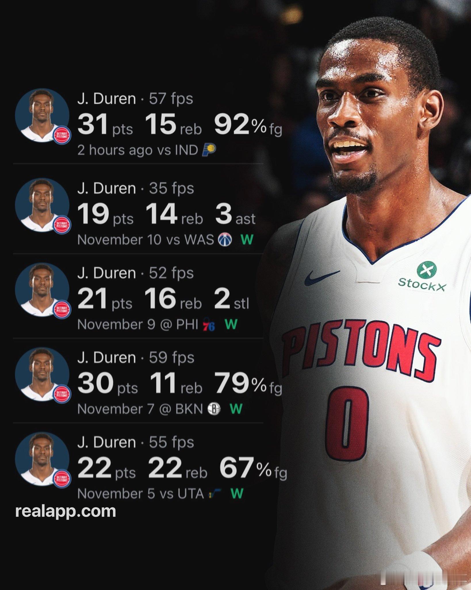 杰伦杜伦在过去的5场比赛中🔥🔥31分 - 15 板- 92% 真实命中率19 分 - 14 板 - 3 助攻21分 - 16 板 - 2 抢断30分- 11 板 - 79% 真实命中率22分 - 22 板 - 67% 真实命中率本赛季场均20.3分12.3篮板1.8助攻,成为了活塞的二当家!这家伙真的打出来了!22届新秀,除了班切罗、霍姆格伦、杰威…又一个比小贾强的出现了
