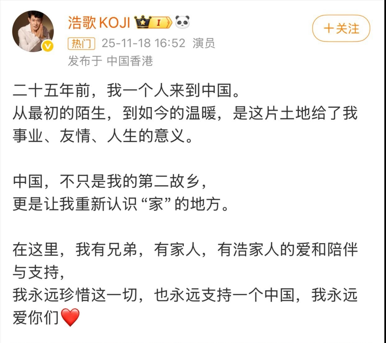 还记得《小兵张嘎》里的矢野浩二吗,近期他也发文支持一个中国!在中国生活了25年,哥真是全方位融入了,还起了中国艺名“浩歌”~从天天向上综艺节目,到现在参加了大大小小无数影视作品,哥也是走出了自己的一条路!没看过他身为日本人饰演的“日本鬼子”经典演绎都会很遗憾的好吗!