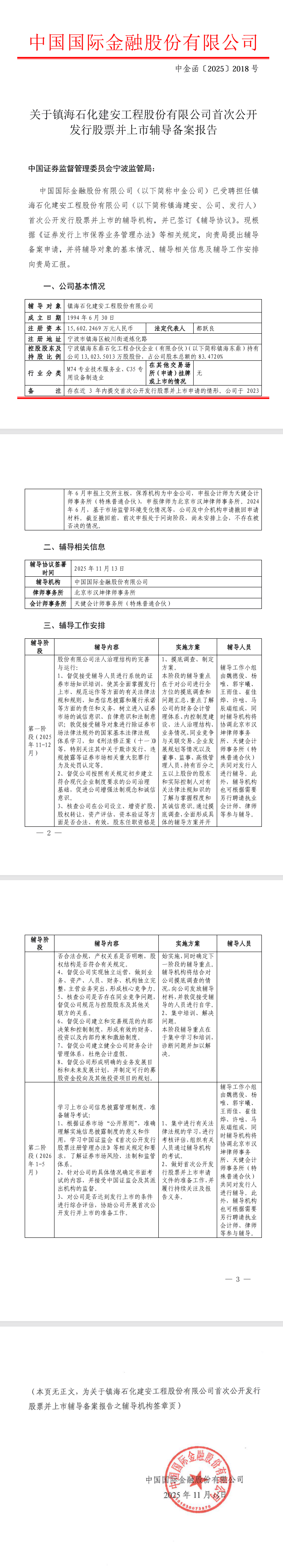 镇海石化建安从名称看,主营业务应与石化工程建筑安装相关。选择“投行贵族”中金公司作为辅导机构,通常意味着企业可能具有较大的融资规模或较高的市场定位。