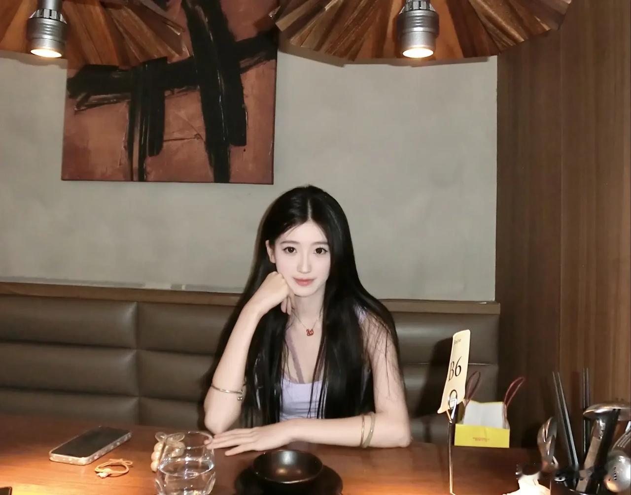 黑发红唇,优雅沉静,粉花点缀,气质如兰。