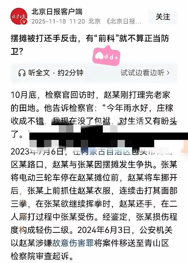 内蒙古包头,刑满释放人员赵某摆摊时和张某发生争执,张某抓住赵某的衣领打了他三拳,欲再打时赵某还手致其受了伤,案发后民警认为赵某涉嫌故意伤害罪,将他移交给了检方审查起诉。赵某不服:难道就因为我有前科,就不算正当防卫了吗? 据北京日报客户端报道,赵某是一名有前科的刑满释放人员,为了养家糊口,赵某买了一辆小三轮,摆摊做起了小生意。 2023年7月6日,赵某正在摆摊时,张某将三轮车停在赵某的三轮车前挡住了他的摊位。 最让人膈应的不是冲突本身,而是“有前科”差点成了定罪的“原罪”,这才是对公平最大的挑战。 张某先挡摊再动手,三拳打下去还不依不饶,赵某还手明明是自保,怎么就成了故意伤害? 法律讲的是事实和证据,不是过去的标签,检方逐帧看监控、开听证会,最终不予起诉,这才是“法不向不法让步”。 刑满释放人员也有正常生活的权利,不能因为曾经犯过错,就失去被法律公平对待的资格。 当有人挥拳相向时,任何人都有自保的权利,这和过去的经历无关。 你觉得“有前科”该不该影响正当防卫的认定?