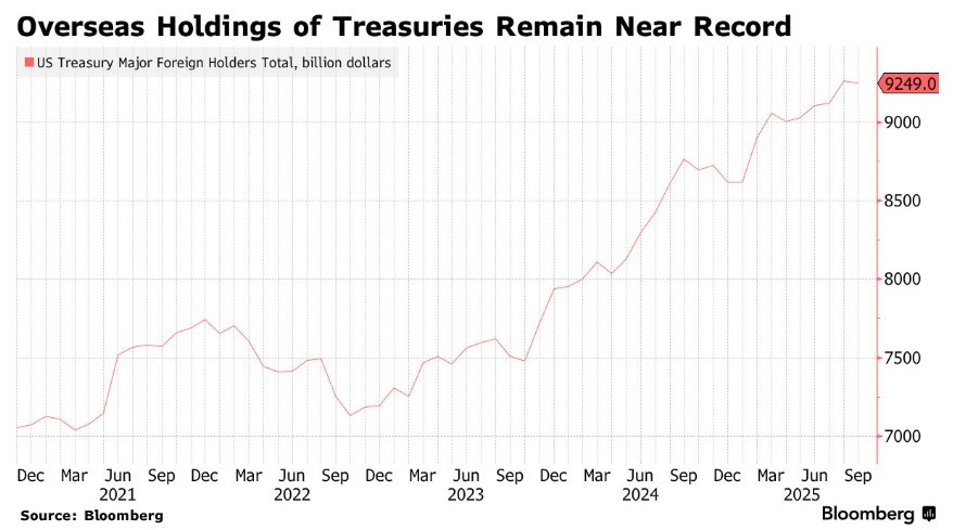 美国政府结束停摆之后公布的最新美债持仓数据显示,9月份海外国家所持有的美国国债规模仍接近历史最高位,这也意味着此前不久在8月创下新的美债持仓历史最高位之后,海外国家整体持有的美国国债规模仅仅呈现出略有回落。最新的海外国家美债持仓凸显出那些嘴上说着“抛售美国”与“美国例外论已经处于崩塌进程”的海外主权财政机构以及大型私人投资机构们实际上正在趁着美债价格在降息预期催化之下的上行时期疯狂买入美债资产或者在收益率反弹时候趁机大举逢低买入美债。
