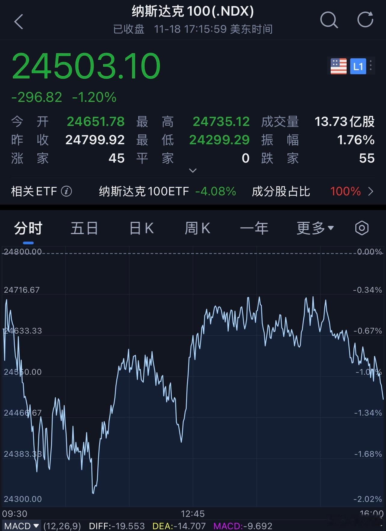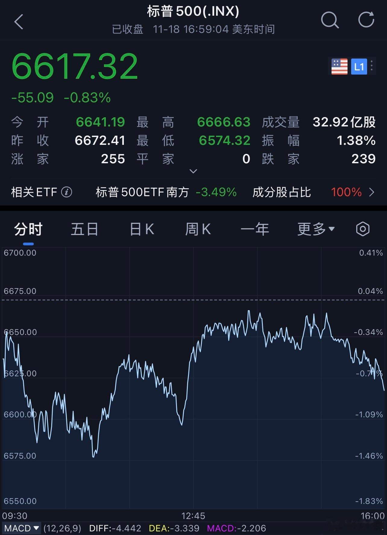 老板们早安,打卡养铁咯昨夜美股三大指数低开低走,道琼斯指数跌1.05%,标普500指数跌0.91%,纳斯达克综合指数跌1.28%,三者均创10月17日以来新低。科技股七巨头指数大跌2.5%,超大市值科技股指数跌2.6%,双双刷新日低。斯托克欧洲600指数下跌2%,至一个多月以来的最低水平。英国富时100指数跌1.56%,法国CAC40指数跌2.34%,德国DAX30指数跌2.03%,富时意大利MIB指数跌2.52%。国际金价反弹。