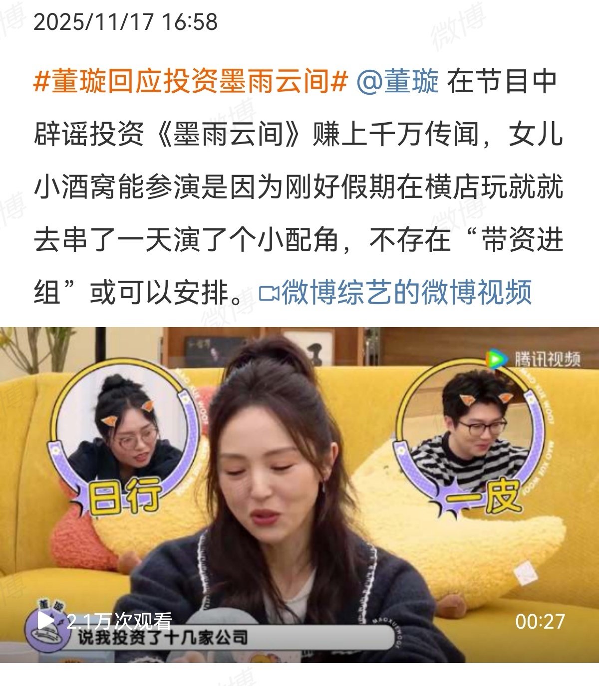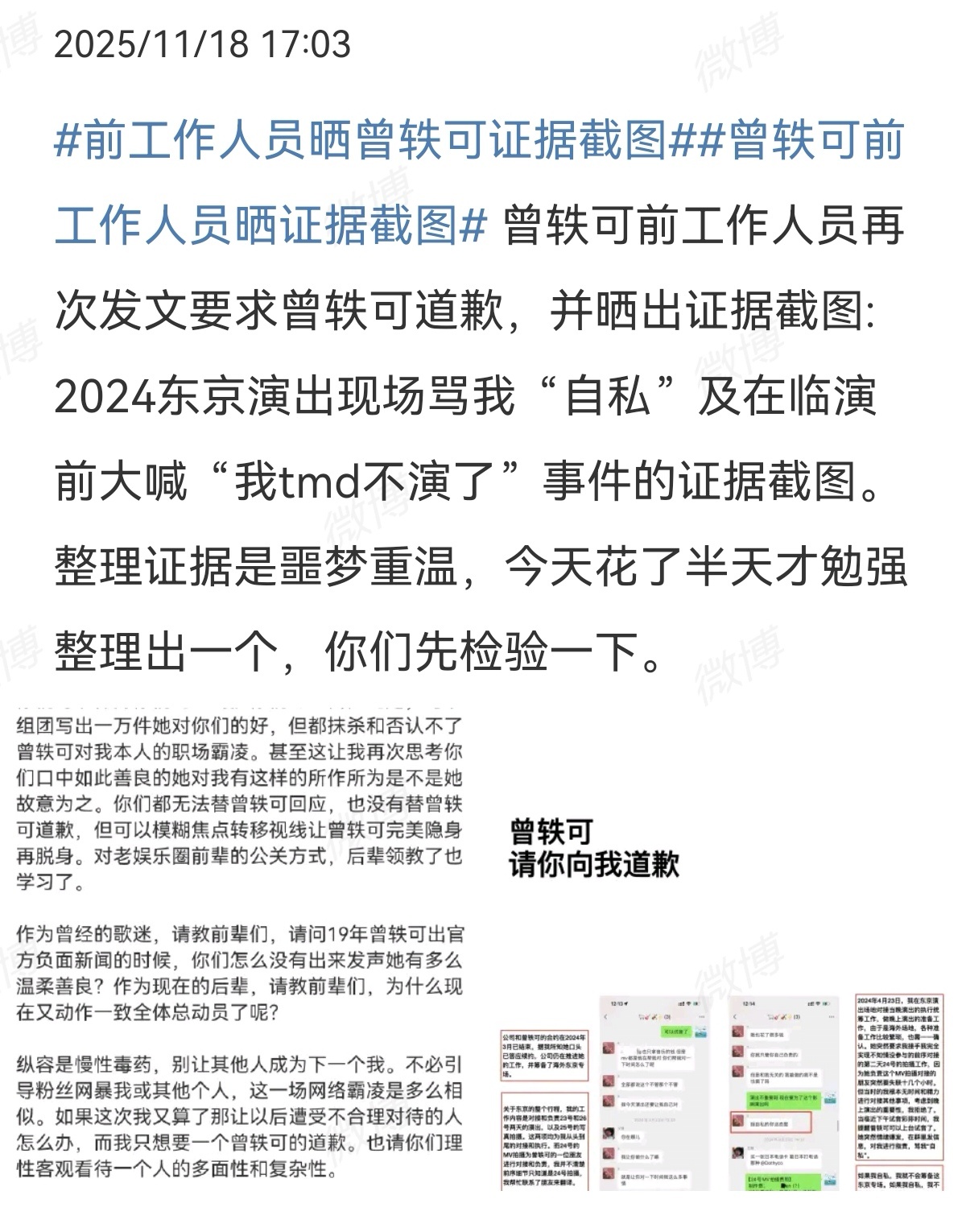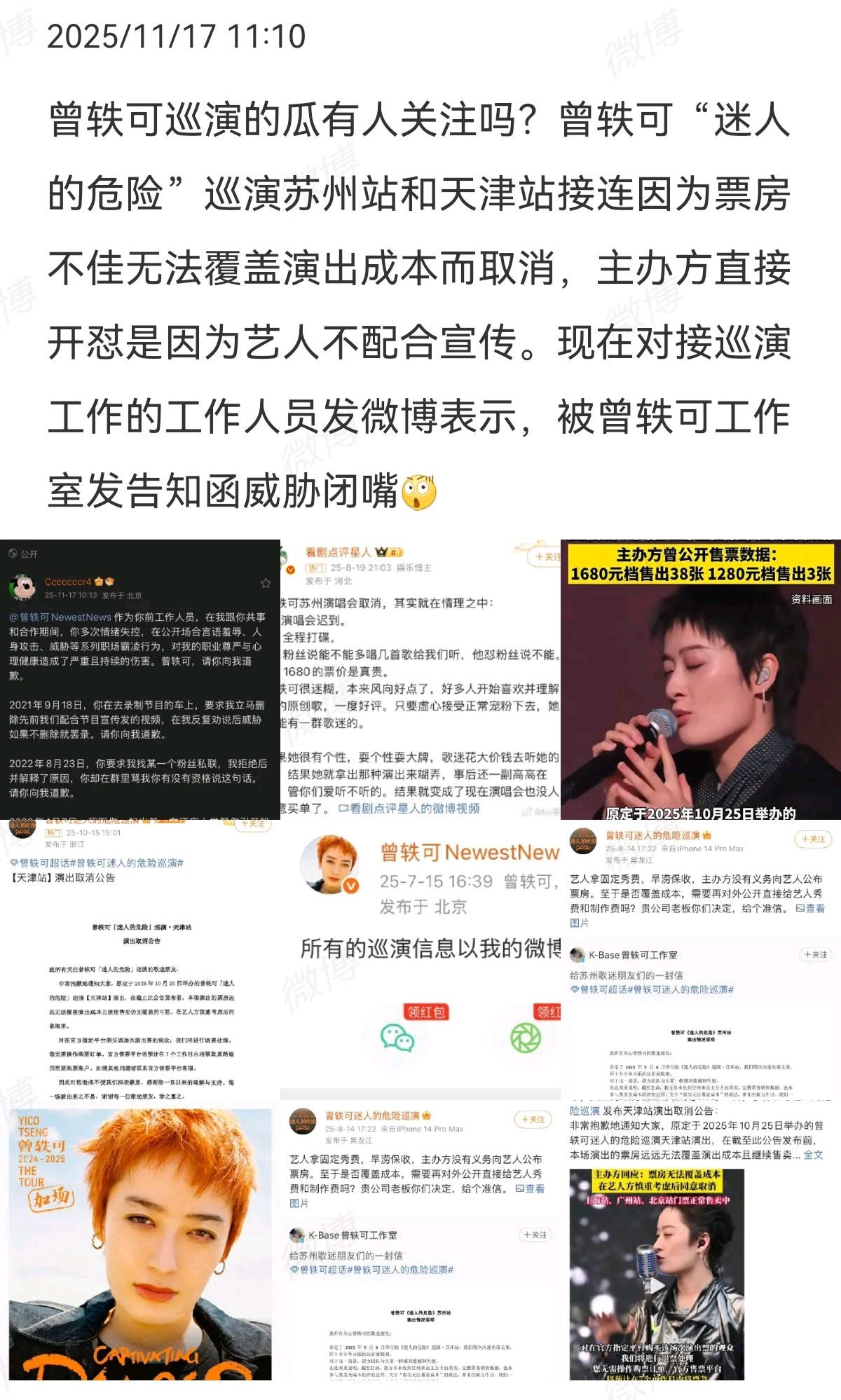 2025-11-18总结①粉丝追机,陈都灵被挤到抱头,工作室发文呼吁理性追星 图1②时代峰峻辟谣左航恋爱传闻,没有拍摄照片,也没有把照片传给别人 图2时代峰峻发声明否认张极私联 图3③赵丽颖打假电影第十七条 图4④董璇辟谣投资墨雨云间,女儿带资进组 图5⑤曾轶可巡演,票房不佳取消,主办方开怼称其不配合宣传,更有工作人员指被其团队威胁闭嘴 图6曾轶可前工作人员再次发文要求曾轶可道歉,并晒出证据截图 图7⑥王中磊夫妻,短视频 图8⑦陈都灵维权,拒绝阴谋论,无真假嘟,克隆人之事 图9⑧徐若晗被指轧戏,同时参与玉簟秋和一路灿烂,一路灿烂剧组方声明,徐若晗此次拍摄为“补拍”,且已提前杀青 图10⑨cosmo,中国版的版权在23年就已经到期,继续借名出,总部维权 图11⑩卓伟爆料喻恩泰也就是武林外传里的吕秀才闹离婚,冷暴力老婆孩子,失联。后俩人共同的朋友出来发微博说是吕秀才的老婆多次出轨 图12撕❶音乐节,任嘉伦被指番位癌 图13❷唐诡,杨旭文粉丝在永拒唐朝诡事录第四季。 图14❸三滴血,文淇路演说羡慕中女,市场没有多余的空间留给年轻女性,被网友吐槽,抢占女演员空间的从来都不是女性 图15❹江山为聘,杀青,陈哲远粉柚子叶庆祝 图16❺你那儿几点,继王安石粉要一番,章若楠粉晒实绩,坚持一番,不平及任何模糊番位行为 图17❻跑男,范丞丞跟李晨友好互动,网友创梗姐姐分手后姐夫把我宠上天,三家粉丝互不爽,沈羽洁宣传图,进一步促进玩梗,被粉丝指偷拍蹭热度,偷跑物料,断章取义传播 图1815号